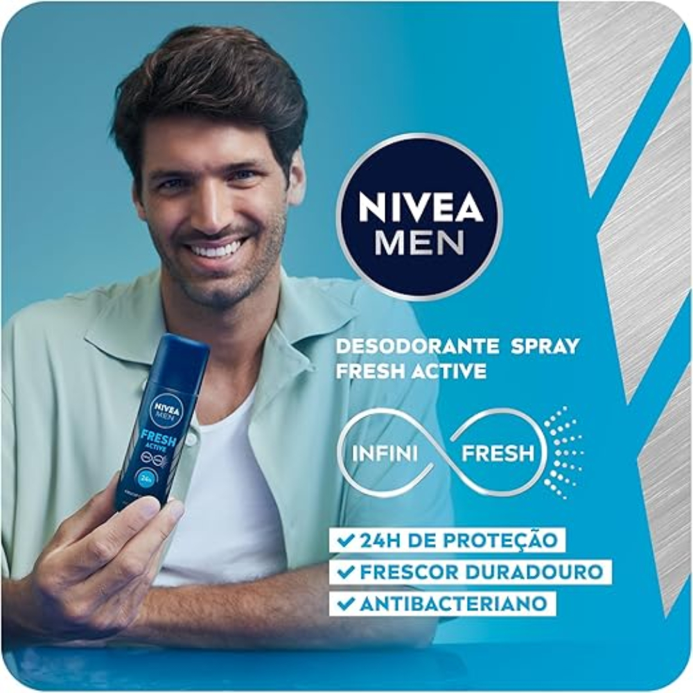 NIVEA FOR MEN Desodorante Spray Fresh Active O NIVEA FOR MEN Desodorante Spray Fresh Active proporciona 24 horas de proteção eficaz contra o mau odor, garantindo uma sensação refrescante prolongada. Sua fórmula, enriquecida com extratos marinhos, combate as bactérias responsáveis pelo odor, oferecendo frescor duradouro, especialmente nos dias quentes de verão. Sem corantes e conservantes, é dermatologicamente testado e possui uma composição suave, que não agride a pele. Além disso, a fórmula NIVEA INFINI FRESH mantém a proteção ao longo do dia com uma aplicação fácil a partir de qualquer ângulo. Benefícios e Diferenciais: ✔ 24h de proteção ✔ Sensação de frescor duradouro ✔ Ação antibacteriana ✔ Fragrância única e refrescante ✔ Sem alumínio, corantes ou conservantes ✔ Protege contra o mau odor da transpiração Modo de uso: Aplique nas axilas a uma distância de pelo menos 15 cm.
