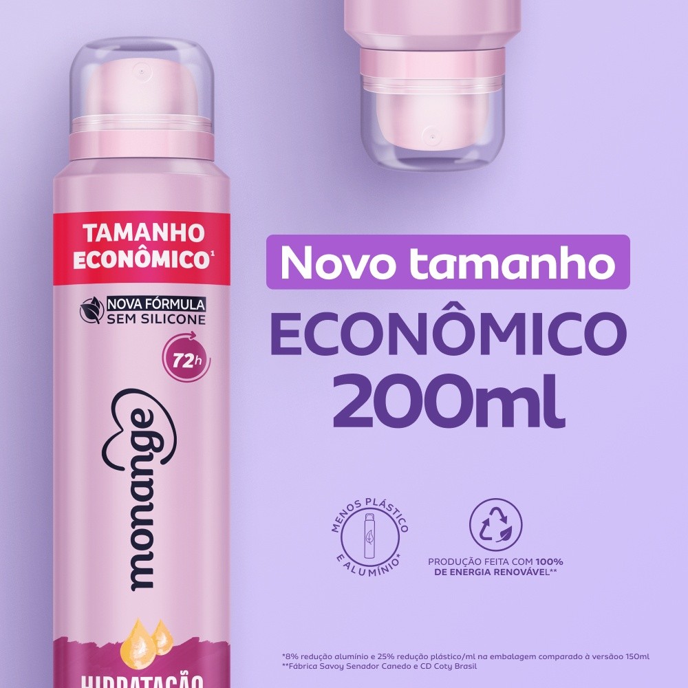 O desodorante Monange Hidratação Intensiva combate os quatro principais sinais de ressecamento das axilas: aparência esbranquiçada, desidratação, perda de elasticidade e toque áspero. Com extrato de oliva, hidrata e nutre a sua pele até a segunda camada (camada subcórnea da epiderme). Sua fragrância cítrica combina notas frutadas com nuances florais brancas e rosas, protegendo suas axilas por até 72h. O desodorante é dermatologicamente testado, além de não conter álcool e silicone. Agora com embalagem econômica, você leva mais por menos! Monange há mais de 5 décadas oferece uma linha completa de produtos para os mais diversos momentos do autocuidado e rotina de beleza da mulher brasileira. Todos os produtos Monange são aprovados pelo programa Leaping Bunny da Cruelty Free International, padrão ouro globalmente reconhecido para produtos livres de crueldade animal.