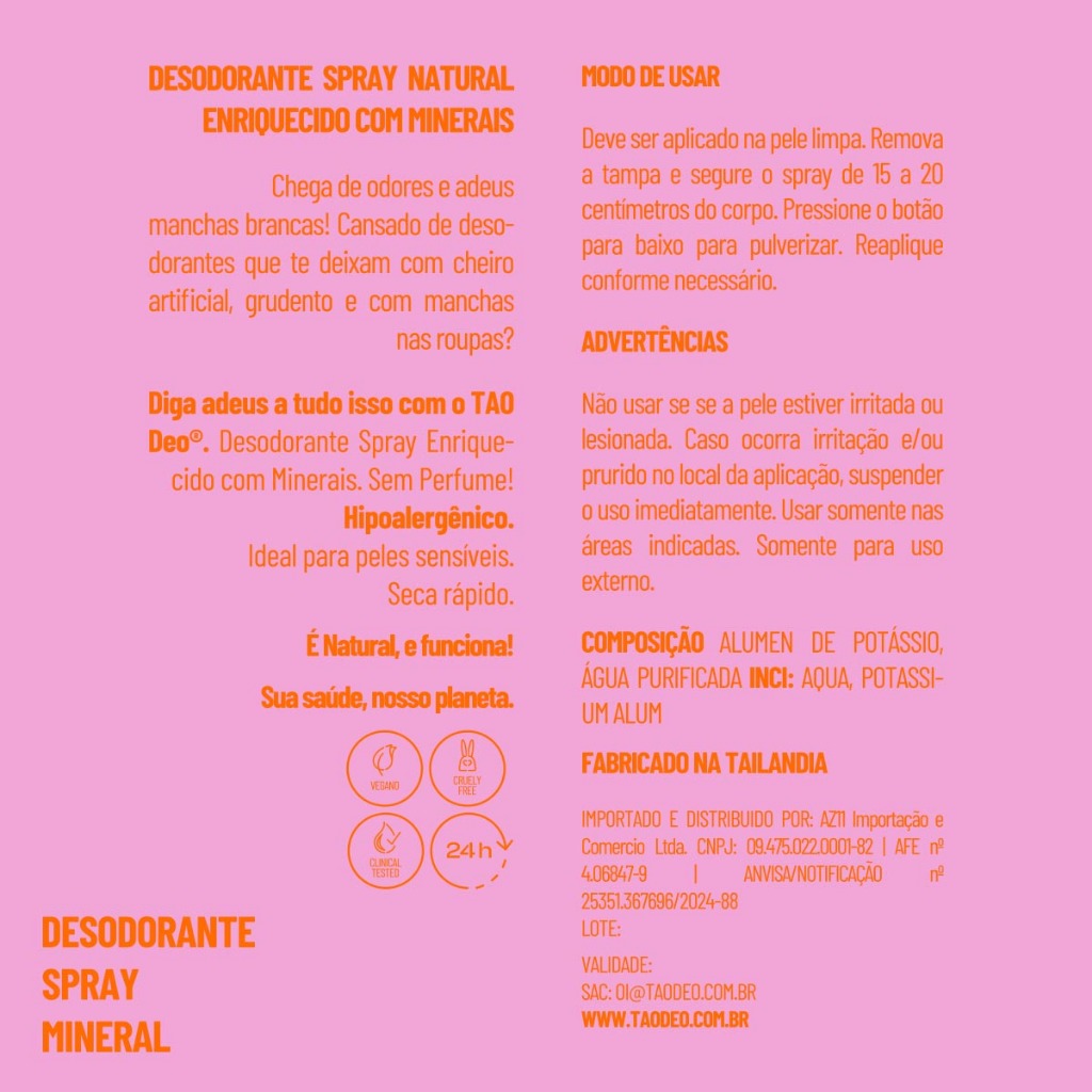 Desodorante Natural Spray 100ml Tao Deo Sem Cheiro Vegano e Hipoalergênico Proteção 24h