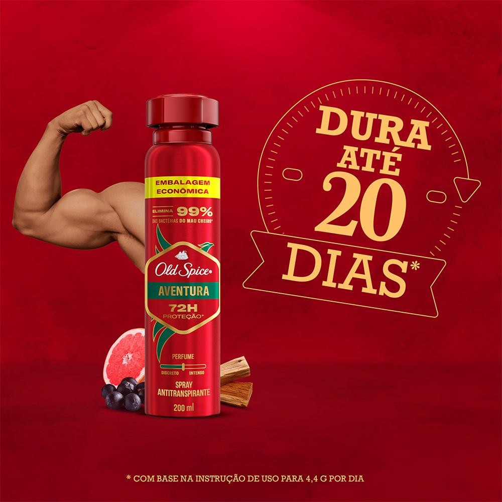 Esteja pronto para novas aventuras com o desodorante antitranspirante em spray Old Spice Aventura! Sinta-se revigorado e protegido contra o suor e o mau cheiro, graças à poderosa fragrância que combina a robustez da madeira com a energia dos cítrico e ervas frescas. E ainda, garanta o menor preço por ML de Old Spice.**Com base em preço por ML para a embalagem de 150ml em comparação a embalagem de 200ml.