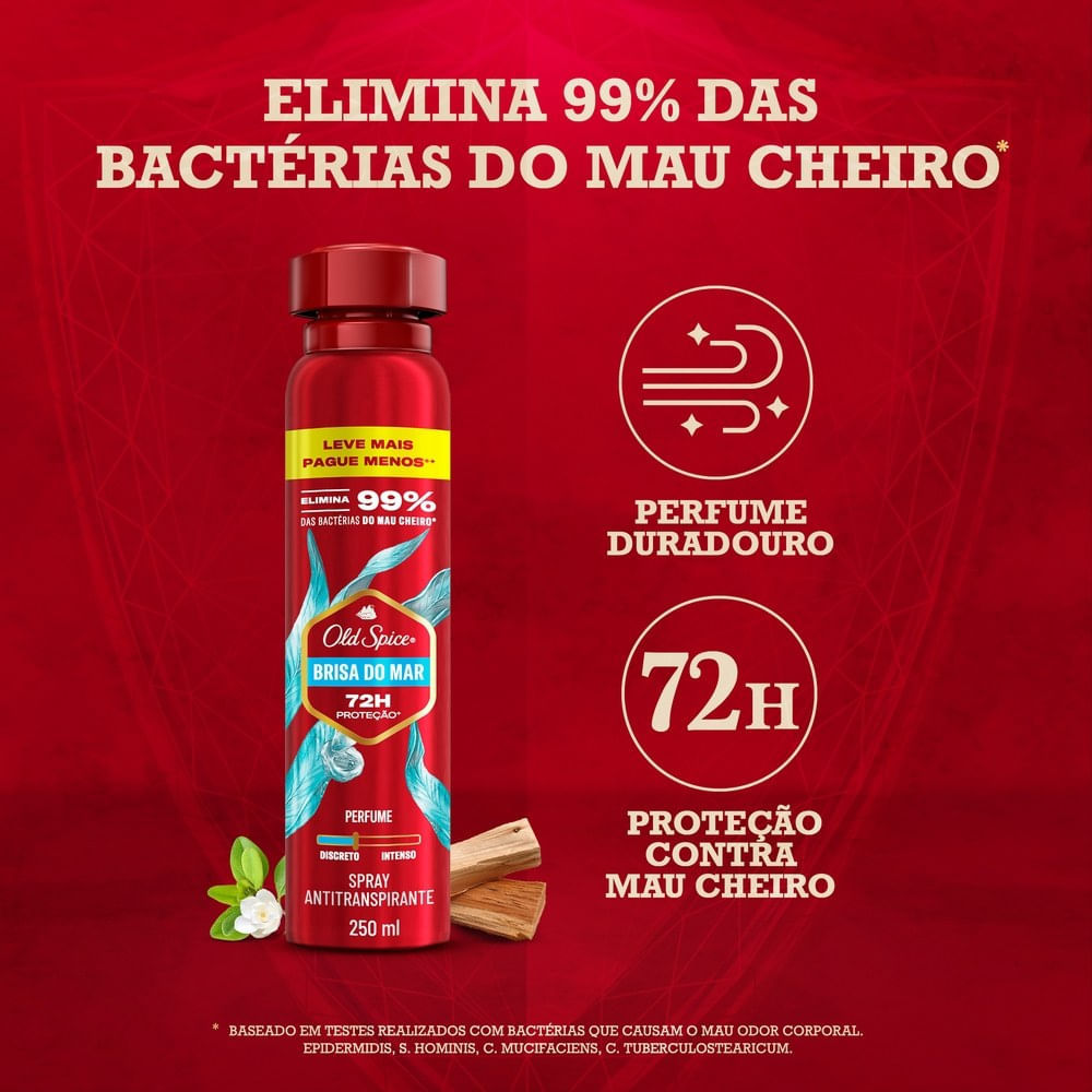 Novo Old Spice 250ml. Leve mais, pague menos Aproveite mais refrescância e proteção contra o suor e o mau cheiro com o desodorante antitranspirante em spray Old Spice Brisa do Mar! Conte com um podero