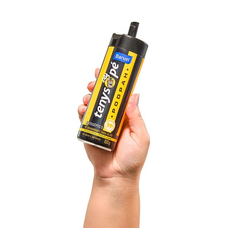 Tenys Pé Baruel Podpah - Com a assinatura do podcast mais zica do Brasil Tenys Pé Baruel é um desodorante em pó para os pés, dermatologicamente testado com ação antisséptica. Tenys Pé Baruel combate 99% dos fungos e bactérias eliminando o mal odor, conta com matéria absorvente que mantém seus pés secos por horas, cheirosos e protegidos com ação desodorante, além de ajudar na conservação do calçado. Benefícios - Antisséptico - Combate 99% de Fungos e Bactérias - Ajuda a evitar frieiras e micoses - Elimina o mau odor - Dermatologicamente testado - Ideal nas atividades esportivas Resultado - Pés secos, cheirosos e com proteção diária, além de calçados mais limpos que duram mais tempo. - Elimina 99% dos fungos e bactérias. - Ajuda a evitar frieiras e micoses nos pés. Dicas de Uso - Aplique diariamente o desodorante para os pés em pó Tenys Pé Baruel nos pés e no interior dos calçados, evitando contato com a parte externa. - Para proteção auxiliar, aplique novamente o produto após o uso do calçado. - Usar antes e depois de atividades esportivas. Perguntas Frequentes 1. Como Tenys Pé age? Tenys Pé foi desenvolvido com ingredientes que agem eficazmente no controle da transpiração excessiva, eliminando fungos e bactérias que causam odores. 2. Qual a diferença entre o talco e aerossol/jato seco? Embora ambos os produtos tenham a mesma finalidade, o desodorante aerossol/jato seco é mais indicado para desodorizar os pés, pois é absorvido imediatamente e não deixa resíduos. Ele também pode ser aplicado dentro dos calçados. Por outro lado, o desodorante em pó é mais adequado para aplicação direta nos calçados, desodorizando-os e ajudando a controlar a umidade. Ambos possuem eficácia desodorante e ação antimicrobiana, combatendo até 99% dos fungos e bactérias. 3. O que fazer em caso de ingestão do produto? Em caso de ingestão, procure ajuda médica imediatamente. 4. Posso usar Tenys Pé no corpo? Não. O Tenys Pé foi desenvolvido para os pés; portanto, não deve ser utilizado em outras partes do corpo. Compre na a marca número 1 em cuidados com os pés Tenys Pé Baruel, que traz a solução completa para manter seus pés cuidados e protegidos, também em versões aerossol/jato seco. Tá no pé de todo mundo!
