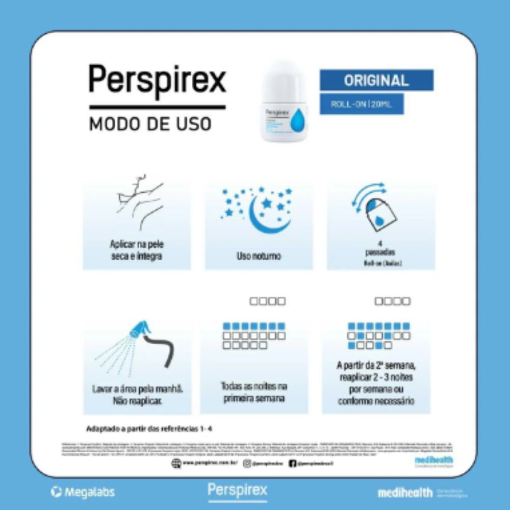 DESODORANTE PERSPIREX ROLL-ON Original. Desodorante antiperspirante. Sem suor, sem cheiro. Perspirex é clinicamente testado para oferecer proteção duradoura contra suor e odor. Sua formulação única po