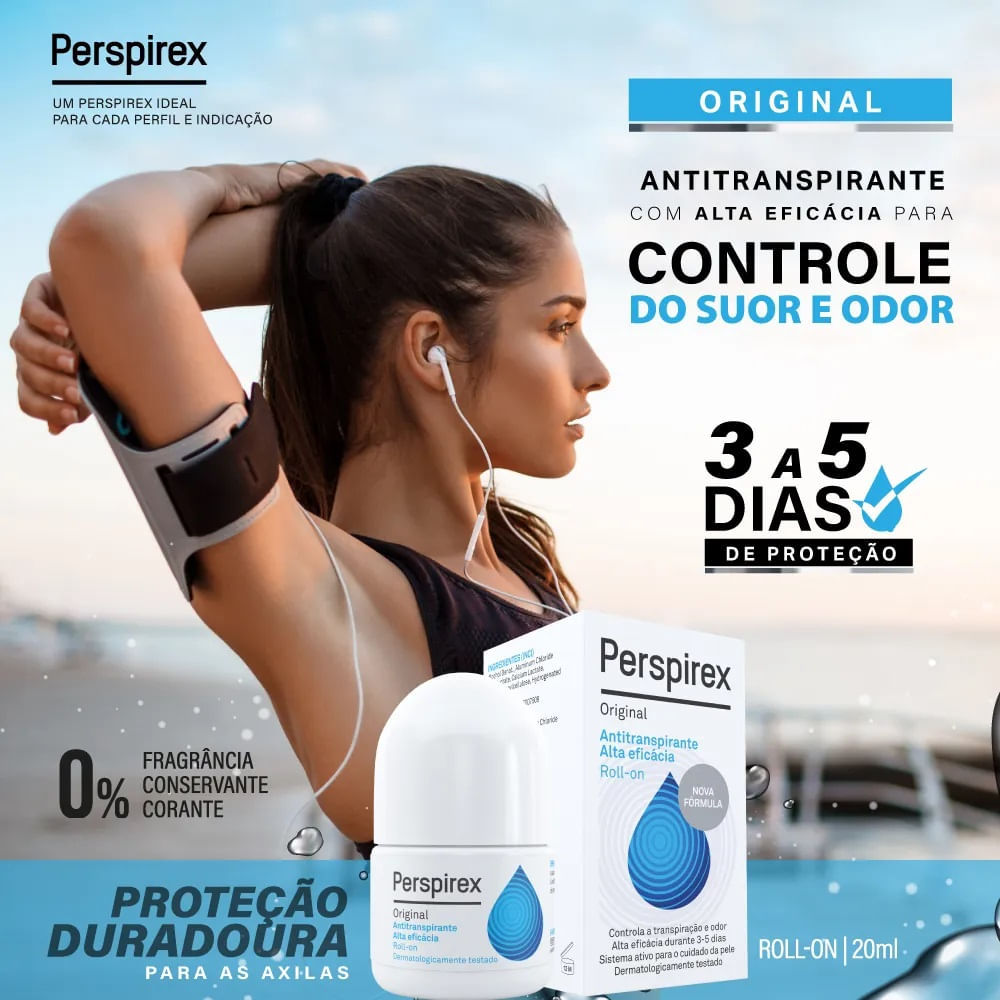Desodorante Perspirex Rollon Antiperspirante 20ml O Desodorante Perspirex Rollon Antiperspirante foi desenvolvido para ser mais eficaz que os desodorantes comuns. O antiperspirante previne a formação de bactérias, eliminando o suor e o odor. A sua composição usa uma fórmula refinada que reduz a irritação geralmente associada a outros antiperspirantes à base de cloreto de alumínio. Sua fórmula sem perfume e livre de manchas é clinicamente testada para fornecer proteção duradoura contra suor e odor. Modo de uso: Aplique o Desodorante Perspirex Rollon Antiperspirante com quatro movimentos: dois para cima e dois para baixo no centro da axila.