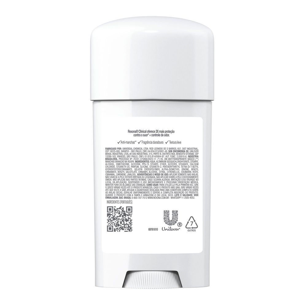 Desodorante Antitranspirante Rexona Clinical Cream Classic 58g O que é e para que serve o Desodorante Rexona Clinical Cream Classic? O desodorante antitranspirante Rexona Clinical Cream Classic 58g foi desenvolvido especialmente para oferecer proteção intensa contra transpiração excessiva e controle eficaz do mau odor. Sua fórmula em creme proporciona aplicação suave e alto desempenho para quem busca mais segurança e frescor ao longo do dia. Com a exclusiva tecnologia Invictus, o produto ajuda a reduzir a produção de suor nas axilas, formando uma barreira protetora que combate o odor causado pelas bactérias. Além disso, conta com ingredientes hidratantes que auxiliam no cuidado da pele, mantendo as axilas mais confortáveis e protegidas. O resultado é uma sensação prolongada de limpeza, com fragrância suave e encapsulada, ideal para quem deseja confiança e proteção durante atividades do dia a dia. Benefícios do Desodorante Antitranspirante Rexona Clinical Proteção 3x mais eficaz contra transpiração excessiva. Controle prolongado do suor e do mau odor. Fórmula com ingrediente hidratante que ajuda no cuidado da pele. Tecnologia Invictus que auxilia na prevenção da transpiração. Proteção duradoura por até 96 horas. Fragrância agradável e encapsulada que libera frescor ao longo do dia. Fórmula sem silicone. Embalagem produzida com materiais reutilizáveis. Como usar o Desodorante Rexona Clinical Cream? Aplique o desodorante em creme Rexona Clinical diretamente nas axilas, deslizando suavemente o produto sobre a pele limpa e seca para garantir melhor absorção e proteção. Advertências Não utilizar o produto se a pele estiver irritada ou lesionada. Em caso de irritação, suspender o uso e procurar orientação médica. Uso externo. Informações Adicionais do Fabricante O Desodorante Antitranspirante Rexona Clinical Classic garante 96 horas de proteção com creme de textura leve, sem deixar manchas brancas nas roupas • A fórmula do Desodorante Clinical Classic oferece 3x mais proteção* contra o suor e controle de odor que um antitranspirante comum • O desodorante Rexona foi desenvolvido com microtecnologia Pro-Defense, que previne o suor, neutraliza o mau odor e refresca • O desodorante Rexona Clinical garante máxima proteção e é suave com sua pele, pois é dermatologicamente testada • Desodorante em creme com uma fragrância floral para você se sentir confiante e fresco o dia todo • Rexona Clinical Classic possui um creme com textura leve que é refrescante ao toque e invisível na pele Descubra a proteção poderosa e rigorosa do Rexona Clinical Creme Invisível Classic, o desodorante antitranspirante em creme desenvolvido para quem precisa de desempenho máximo no dia a dia, sem abrir mão de conforto e cuidado com a pele e com as roupas. Com 96 horas de proteção antitranspirante, ele proporciona uma sensação refrescante, mesmo nos momentos mais intensos. Sua fórmula exclusiva oferece 3x mais proteção* contra o suor em comparação com um antitranspirante comum, além de controlar o mau odor. Com a avançada microtecnologia Pro-Defense, a Rexona Clinical atua em sintonia com seu corpo, oferecendo uma resposta de tripla ação: previne o suor com nosso ativo mais potente, neutraliza o mau odor com liberação de ativos conforme o movimento, e refresca com moléculas de fragilidades ativadas pelo suor — mantendo você limpo, fresco e protegido durante todo o dia, mesmo em situações de calor, estresse ou exercício físico. Além do desempenho, Rexona Clinical é dermatologicamente testado: poderoso na proteção, suave com a pele. Sua fragrância floral fresca, com notas de rosa, jasmim e bergamota, é liberada gradualmente por cápsulas de liberação controlada, garantindo frescor contínuo e sensação de limpeza por muito mais tempo. O formato em creme possui textura leve com aplicação invisível, prevenindo manchas brancas nas roupas, além de secar rápido, não deixando sensação pegajosa na pele. A aplicação noturna também é recomendada: a fórmula é ativada enquanto dorme, entregando proteção ao longo do dia seguinte. *Vs. um antitranspirante básico.