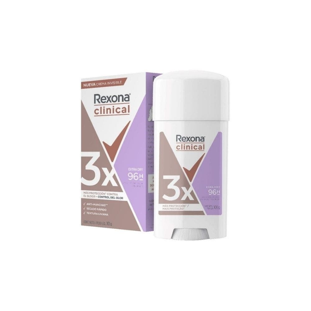 #html-body [data-pb-style=PQWAJ4W]{justify-content:Flex-start;display:Flex;flex-direction:Column;background-position:Left top;background-size:Cover;background-repeat:No-repeat;background-attachment:Scroll}Rexona Women Clinical Extra Dry é um desodorante antitranspirante desenvolvido exclusivamente para o universo feminino. Ele possui uma inovadora fórmula termoativa com a exclusiva tecnologia Trisolid que se adequa ao corpo e proporciona proteção extra até o dia seguinte, mesmo após o banho. O desodorante antitranspirante Rexona Women Clinical Extra Dry oferece até 3X mais proteção do que os antitranspirantes comuns, ou seja, com ele você terá até 96 horas de proteção intensa contra o suor e o mau cheiro. Além disso, ele combina ingredientes hidratantes que não agridem a pele. Principais benefícios do Desodorante Antitranspirante em Creme Stick Rexona Clinical Extra Dry Feminino: Inovadora fórmula termoativa. Exclusiva tecnologia Trisolid que se adapta ao corpo. Proteção extra até o dia seguinte, mesmo após o banho. Até 3X mais proteção do que antitranspirantes comuns Combina ingredientes hidratantes que não agridem a pele. Forma camada protetora sobre as glândulas sudoríparas Diminui o suor e garante sensação de segurança duradoura. Disponível no formato stick, de fácil aplicação. 20% tetraclorohidrex de alumínio/zircônio GLY. Testado Dermatologicamente. Como usar o Desodorante Antitranspirante em Creme Stick Rexona Clinical Extra Dry Feminino? O Desodorante Antitranspirante em Creme Stick Rexona Clinical Extra Dry pode ser aplicado diariamente, direto na pele das axilas. Recomendações importantes: Aplicar somente nas axilas. Não usar se a pele estiver irritada ou lesionada. Não aplicar sobre a pele excessivamente úmida. Não aplicar nas partes íntimas. Caso ocorra alergia, irritação e/ou prurido no local da aplicação, suspender o uso imediatamente e procurar orientação médica. Advertências: Uso externo. Não ingerir. Caso haja contato com os olhos, lave-os abundantemente. Se houver irritação, suspenda o uso imediatamente e procure orientação médica. Mantenha fora do alcance das crianças e animais domésticos.