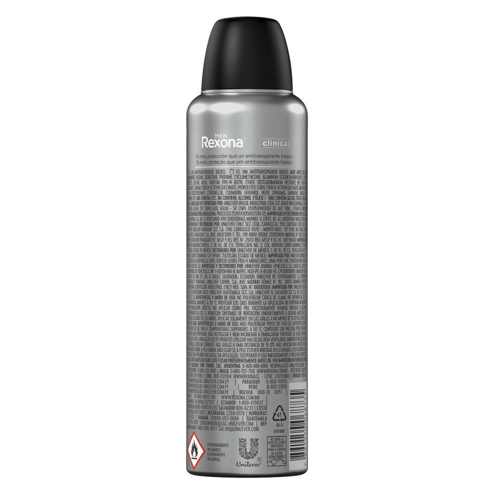 • O Desodorante Antitranspirante Rexona Men Clinical Sport garante 96 horas de proteção contra suor e mau odor • Esse antitranspirante protege 3x mais contra a transpiração excessiva* e odor corporal que um antitranspirante comum • O Desodorante Clinical Rexona é um aerosol de alta performance com secagem rápida • A fórmula de Rexona Men Clinical garante máxima proteção e não deixa manchas nem marcas em suas roupas • Desodorante aerosol com uma textura leve e um perfume agradável, fácil de aplicar, para que se sinta sempre seco e limpo • Rexona Men Clinical Sport está disponível no formato desodorante aerosol A transpiração e o mau odor podem ser uma limitação na vida de muitas pessoas, o sentimento de desconforto toma conta nessas situações. Pensando nisso, Rexona desenvolveu o Desodorante Antitranspirante Aerosol Rexona Men Clinical Sport, que protege 3x mais contra a transpiração excessiva* e odor corporal que um antitranspirante comum. Este antitranspirante possui ingredientes de alta performance que garantem 96 horas de proteção contra o suor e controle de odor, para se sentir sempre seco e refrescado. Possui uma fórmula com textura leve e de secagem rápida, que não deixa manchas** nem marcas em suas roupas. Para aplicar, agite bem antes de usar. Segure a lata a uma distância de 15 cm das suas axilas. Evite inalar diretamente. Aplique pequenas quantidades do produto em locais bem ventilados. Cada vez mais usamos materiais reutilizáveis em nossas embalagens, e facilitamos o descarte consciente da sua embalagem de desodorante para um planeta em movimento. É inofensivo para a camada do ozônio. A missão de Rexona é entender cada vez mais sobre a transpiração e toda a linha de desodorantes antitranspirantes foi desenvolvida com tecnologia de ponta para que você possa desafiar os seus limites diariamente. Os produtos Rexona permitem você fazer mais, sem se preocupar com a transpiração. Rexona garante a melhor proteção contra a transpiração. Rexona Clinical, não te abandona! *vs. um antitranspirantes básico.