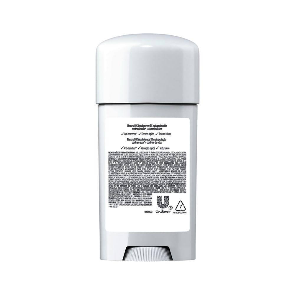 *Produto Original* *Atenção:* Venda exclusiva para pessoa física. Pedidos com CNPJ serão cancelados. Desodorante Rexona Clinical Extra Dry Antitranspirante em Creme Stick Feminino com 58g Máxima proteção para as mulheres. Protege 3x mais que um antitranspirante comum. Tecnologia TriSolid. Hidratação e fragrância encapsulada. 20% de ativos antitranspirantes.