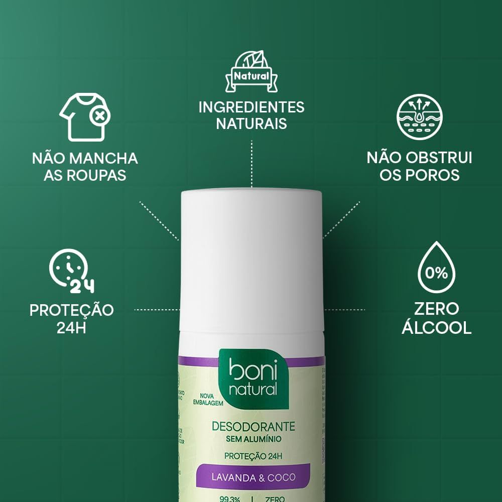 Transforme sua rotina com o Desodorante Roll-On Lavanda e Coco Boni Natural! Enriquecido com o toque suave do coco, conhecido por suas propriedades hidratantes e nutritivas, ele ajuda a manter a pele macia, confortável e bem cuidada ao longo do dia. A lavanda traz uma fragrância delicada e relaxante, proporcionando uma sensação agradável de bem-estar a cada aplicação. Com fórmula 99,3% vegetal e mineral, sem cloridrato de alumínio e sem ingredientes químicos agressivos, oferece proteção efetiva por 24 horas contra o odor, enquanto cuida da pele com suavidade. Vegano e livre de parabenos e triclosan, é uma escolha mais consciente para quem busca proteção diária com conforto, leveza e um perfume suave que transforma a rotina de autocuidado. Escolher produtos com fórmulas mais naturais e limpas é levar mais consciência para a rotina de autocuidado. Mesmo quando o uso é externo, dia após dia a nossa boca e gengivas, pele e couro cabeludo estão em contato direto com tudo o que aplicamos. Por isso, optar por composições mais criteriosas, com ingredientes de origem natural e sem certos componentes que muitos consumidores preferem evitar, é uma forma de alinhar bem-estar, cuidado e escolhas mais conscientes.