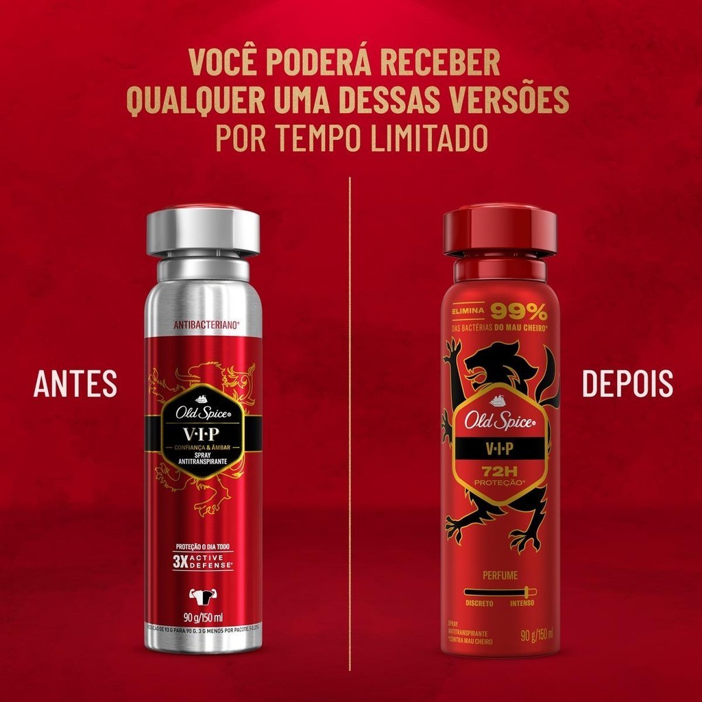 Experimente um toque de exclusividade com o desodorante antitranspirante em spray Old Spice VIP! Sinta-se revigorado e pronto para encarar o dia com confiança, graças à proteção contra o suor e o mau cheiro. Conte com uma fragrância frutada com notas verdes e especiarias. • Elimina 99% das bactérias do mau cheiro**Baseado em testes realizados com bactérias que causam o mau odor corporal: S. EPIDERMIDIS, S. HOMINIS, C. MUCIFACIENS, C. TUBERCULOSTEARICUM • 72 horas de proteção contra o mau cheiro • Sensação de frescor duradouro • Fragrância cítrica com notas amadeiradas e herbais • Você longe do cheiro de cecê ou suor • Dura até 20 días****Com base na instruçao de uso para 4.4g por día • • |