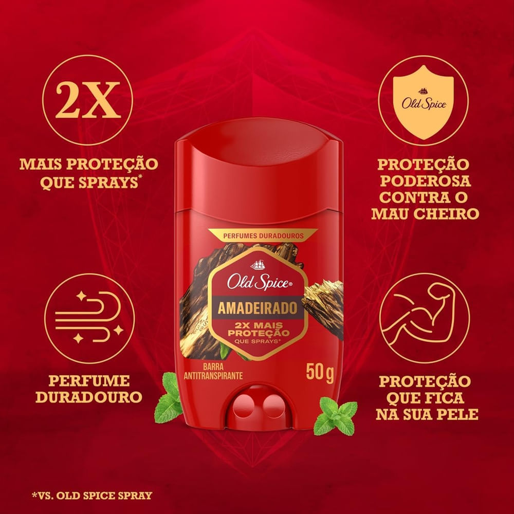O Desodorante Stick Old Spice Amadeirado traz uma proteção eficaz com uma fragrância amadeirada, combinada com menta e especiarias, que proporciona confiança e frescor. Oferece o dobro de proteção comparado a sprays, mantendo o mau odor e o suor afastados por até 40 dias. A aplicação é prática e uniforme, garantindo um perfume duradouro. Benefícios: - Proteção antitranspirante prolongada; - Fragrância sofisticada e envolvente; - Mantém a pele seca e fresca. Modo de usar: Aplicar diretamente nas axilas secas. Use diariamente para garantir a proteção completa. Sobre a marca: Old Spice para homens surgiu em 1938, criado por William Lightfoot Schultz e sua primeira essência permanece lendária. Em 1990 começou a ser fabricado pela P&G onde sofreu algumas alterações e é um sucesso de vendas em vários países. Nos EUA este desodorante é o mais procurado pelos homens no mercado popular.