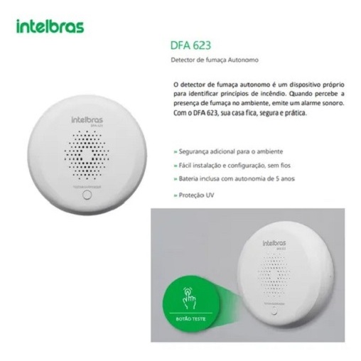 DFA 623 - Detector de Fumaça Autônomo O detector de fumaça autonomo é um dispositivo próprio para identificar princípios de incêndio. Quando percebe a presença de fumaça no ambiente, emite um alarme sonoro. Com o DFA 623, sua casa fica, segura e prática » Segurança adicional para o ambiente » Fácil instalação e configuração, sem fios » Bateria inclusa com autonomia de 5 anos » Proteção UV » 1 ano de garantia Especificações técnicas » Tensão de operação 1 bateria 9vdc alcalina » Autonomia da bateria 5 anos (1 teste por semana) » Volume do alarme 85 dB (1 m) » Temperatura de operação -10 a 60 °C » Umidade de operação < 95% sem condensação » Dimensões (Ø X A) 101 X 43 mm » Sensibilidade de disparo 0,13 0,25 dB/m » Peso Bruto 200 g » Peso líquido 180 g Segurança extra para sua casa ou escritório Priorize a segurança da sua família e dos seus bens com um detector de fumaça autônomo. Este dispositivo identifica fumaça e emite alerta sonoro, garantindo proteção contra princípios de incêndio. Funcionamento totalmente autônomo e prático Segurança autônoma, simples e eficaz, com ótimo custo-benefício, sem a necessidade de outros produtos. Produto indicado apenas para ambientes residenciais e pequenos escritórios, onde não há obrigatoriedade de um SDAI (Sistema de Detecção e Alarme de Incêndio). Instalação fácil com sistema Plug & Play Instalação simples: conecte a bateria e fixe no teto para garantir um ambiente ainda mais seguro. Bateria 9V inclusa e LED indicativo de funcionamento GARANTIA DE 12 MESES DIRETO COM A INTELBRAS. Detecção e alarme sonoro sem preocupações. Teste o funcionamento pressionando o botão "Testar / Suspender".