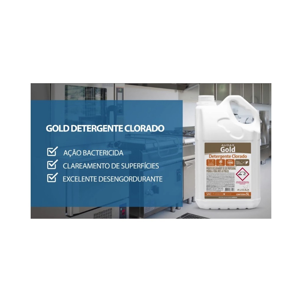 Detergente Clorado 5L Gold Desenvolvido para desinfecção, limpeza e clareamento das superfícies em ambientes de fluxo alto, médio e baixo. Com excelente ação bactericida, possui agentes de alto poder de remoção nas sujidades gordurosas e manchas impregnadas. Tem comprovada eficiência contra bactérias como: Staphylococcus aureus, Salmonella e Pseudomonas aeruginosa. Indicado para desinfetar ralos, lixeiras, vasos sanitários, banheiros, pisos não tratados, mármores, louças, vidros, cerâmicas, azulejos e utensílios de polipropileno. Ideal para cozinhas industriais e hospitais em geral. Cor: Incolor Fragrância: Característica Diluição: - Desinfecção e Limpeza Pesada: 01 parte do produto para 30 partes de água; - Limpeza Leve: 01 parte do produto para 100 partes de água. Embalagem: 01 unidade com 5L