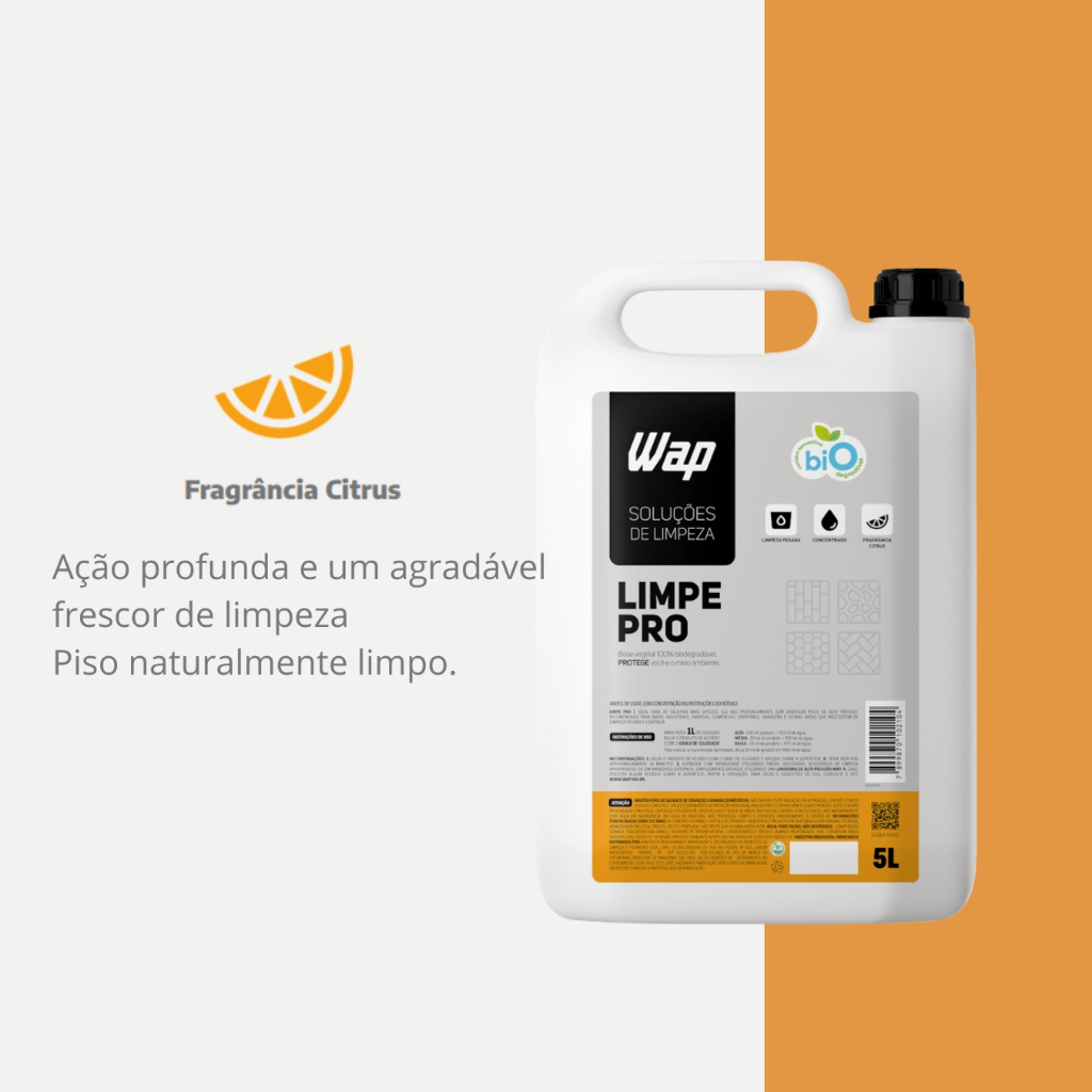 Detergente Concentrado Para Limpeza Pesada de Pisos 5L WAP Limpe Pro CP3242.....................................................................................................................................INFORMAÇÕES SOBRE O PRODUTO.....................................................................................................................................Escolher os produtos de limpeza corretos para cada uso faz toda a diferença. Melhor ainda quando cuidam da sua casa e ainda não agridem o meio ambiente Indicada para diversos tipos de superfície, as soluções de limpeza WAP trazem uma higienização eficiente e ainda deliciosa fragrância. A linha conta tanto com produtos de limpeza para casa quanto produtos de limpeza profissional......................................................................................................................................ESPECIFICAÇÕES DO PRODUTO.....................................................................................................................................Desenvolvido para as sujeiras mais pesadas, é altamente econômicoe age profundamente sem danificar os pisosComposto por: Tensoativo não iônico, solvente de origem vegetal, conservantes e veículo.Recomendado para limpeza de:grandes pátios, áreas industriais, fábricas, comércios, shoppings,garagens e locais que necessitem de limpeza pesada e contínuaFÓRMULA CONCENTRADA para limpeza pesadaO WAP LIMPE PRO pode ser utilizado junto às lavadoras de alta pressão WAP, conferindo agilidade e excelente resultado.DILUIÇÃO:Para fazer 1L de solução, dilua o produto de acordo com o grau de sujidade.ALTA· 250mL produto 750mL de água.MÉDIA· 50mL do produto 950mL de água.BAIXA· 25mL de produto 975mL de água.Para realizar a manutenção da limpeza, dilua 10mL de produto em 990mL de água.Base vegetal 100% biodegradávelO WAP Limpe Pro não deixa resíduos e em apenas 18 dias é totalmente absorvido pela natureza causando menos impacto ambiental.Fragrância CitrusAção profunda e um agradável frescor de limpeza.Piso naturalmente limpo......................................................................................................................................DÚVIDAS FREQUENTES.....................................................................................................................................Pergunta: Como é embalado o produto?Resposta: Todos os nossos produtos vendidos são embalados em caixas lacradas ou plástico stretch. Em respeito ao meio ambiente 90% das caixas são reutilizadas.Pergunta: Quem faz a entrega?Resposta: A entrega é terceirizada, feita via CORREIOS ou TRANSPORTADORA.Pergunta: O envio é feito em quantos dias?Resposta: Nós enviamos o seu pedido no prazo máximo de 24 horas após a confirmação de sua compra, sendo um dos envios mais rápidos da plataforma.Pergunta: Os produtos são novos ou usados?Resposta: Todos os produtos que trabalhamos são novos e com qualidade garantida......................................................................................................................................