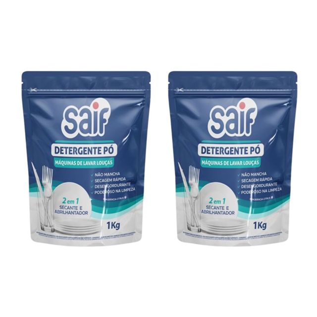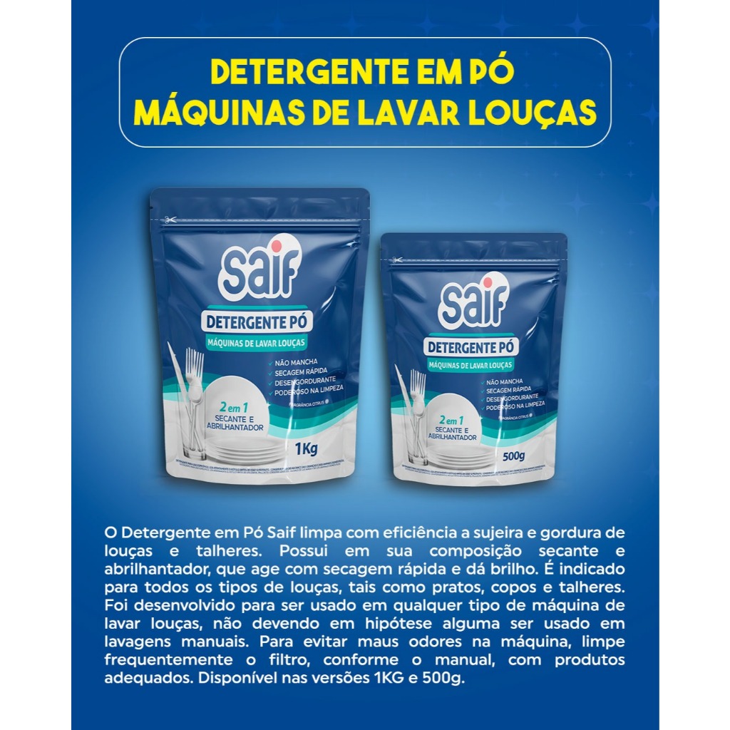 O Detergente em Pó Saif limpa com eficiência a sujeira e gordura de louças e talheres. Possui em sua composição secante e abrilhantador, que age com secagem rápida e dá brilho. É indicado para todos os tipos de louças, tais como pratos, copos e talheres. Foi desenvolvido para ser usado em qualquer tipo de máquina de lavar louças, não devendo ser usado em lavagens manuais. Disponível nas versões 1kg e 500g.