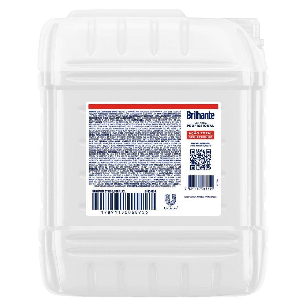 •Detergente Líquido Brilhante Limpeza Profissional Ação Total Sem Perfume é o lava roupas e limpador de uso geral líquido para limpeza de tecidos e superfícies em áreas que tenham restrição de odores •Este produto 2 em 1 é ideal para lavagem de tecidos e limpeza pesada de múltiplas superfícies* de uso profissional •Este detergente líquido concentrado de alto desempenho é sem perfume e hipoalergênico, ou seja, sua formulação minimiza as reações alérgicas •O Sabão Líquido Brilhante Ação Total Sem Perfume é ideal para uso em serviços de alimentação e lavanderia, como bares e restaurantes, pois não interfere no aroma do seu estabelecimento •Este detergente líquido 2 em 1 é ideal para lavagem de tecidos (uniformes, toalhas de mesa e guardanapos) e limpeza pesada de múltiplas superfícies* (como pisos****, azulejos e outras) •Este sabão líquido é um produto mais sustentável! Embalagem reciclável, seu ativo biodegradável e a fórmula sem fosfato. Possui um rendimento imbatível: rende 90 lavagens** e 1.050 L de limpeza*** O Detergente Líquido Brilhante Limpeza Profissional Ação Total Sem Perfume é o lava roupas e limpador de uso geral líquido que faz parte do portfólio neutro da Unilever Pro. Ele foi desenvolvido especialmente para a limpeza de restaurantes, bares, lanchonetes, padarias, entre outros serviços de alimentação cujos ambientes contam com restrição de odores ou lidam com manipulação de alimentos. Por essa razão, eles não podem utilizar produtos com fragrância em suas dependências, de acordo com as normas estipuladas pela ANVISA (Agência Nacional de Vigilância Sanitária). *Solução de produto testada em superfícies de azulejo, piso vinílico, aço inoxidável, porcelanato e alumínio. **Rendimento calculado de acordo com a recomendação de uso para sujeira moderada. Máquina de capacidade 11 kg. ***Rendimento calculado de acordo com a recomendação de uso para limpeza diária. ****Pisos que possam ser lavados.
