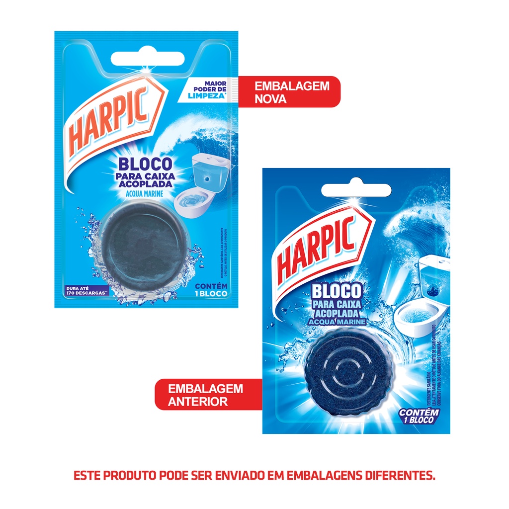 Limpador e Aromatizador Sanitario para Caixa Acoplada Marine Harpic. Bloco Sanitário Harpic para Caixa Acoplada 50G Acqua Marine Harpic para Caixa Acoplada é indicado para a limpeza completa do seu vaso começando pela caixa acoplada. Os agentes de espuma e limpeza liberam uma agradável fragrância, além de manter a água do seu vaso colorida. Benefícios: Harpic tablete para caixa acoplada é especialmente indicado para a limpeza completa do vaso sanitário com caixa acoplada começando pela própria caixa acoplada e chegando até as paredes do vaso sanitário. Os agentes de espuma e limpeza de vaso sanitário do tablete liberam uma agradável fragrância de pinho descarga após descarga use regularmente para manter vaso sanitário limpo e brilhante. Instruções de uso: Abra a embalagem do produto. Não remova o plástico que envolve o tablete. O plástico se dissolverá em contato com a água; Remova a tampa da caixa acoplada; Jogue o bloco dentro da caixa acoplada longe da saída de água; Recoloque a tampa e aguarde 10 minutos para acionar a descarga; Quando a coloração da água diminuir, coloque outro bloco. Marca: Harpic Apresentação: Bloco Sanitário Harpic para Caixa Acoplada 50G Acqua Marine Rendimento: Até 200 descargas