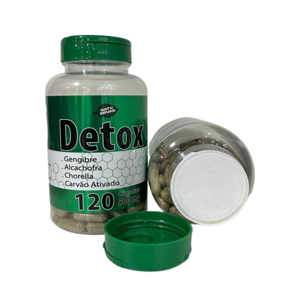suplemento alimentar detox 100% natural cada pote contem 120 capsulas de 500 mg tomar 3 capsulas ao dia
