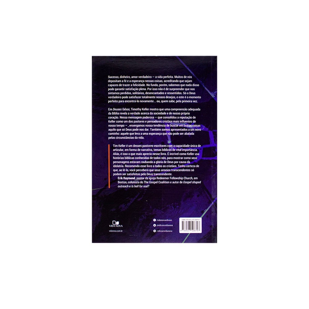Sucesso, dinheiro, amor verdadeiro — a vida perfeita. Muitos de nós depositam a fé e a esperança nessas coisas, acreditando que sejam capazes de trazer a felicidade. No fundo, porém, sabemos que nada disso pode garantir satisfação plena. Por isso não é de surpreender que nos sintamos perdidos, solitários, desencantados e ressentidos. Só o Deus verdadeiro pode satisfazer totalmente nossos desejos, e este é o momento perfeito para encontrá-lo novamente. Ou, quem sabe, pela primeira vez. Em Deuses falsos, Timothy Keller mostra que uma compreensão adequada da Bíblia revela a verdade acerca da sociedade e de nosso próprio coração. Nessa mensagem poderosa, enxergamos nossa tendência de buscar em outras coisas aquilo que só Deus pode nos dar. Também somos apresentados a um novo caminho: aquele que leva a uma esperança que não pode ser abalada pelas circunstâncias da vida. Publicado anteriormente por outra editora 192 páginas 21x14cm