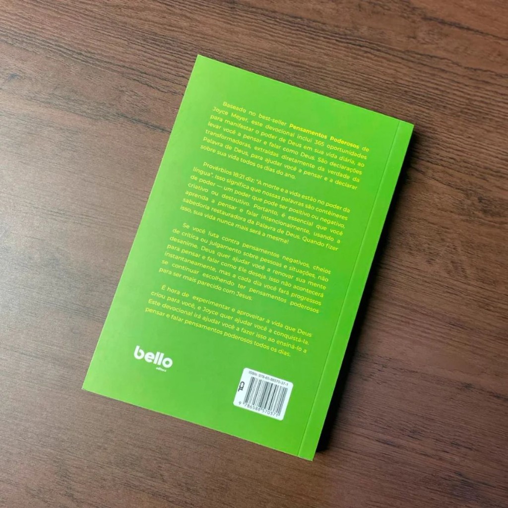 Devocional 365 dias | Pensamentos Poderosos | Joyce Meyer Baseado no best-seller Pensamentos Poderosos de Joyce Meyer, este devocional oferece 365 inspirações diárias para manifestar o poder de Deus em sua vida. Através de declarações transformadoras extraídas da Palavra de Deus, você aprenderá a pensar e a falar como Deus deseja. Com base em Provérbios 18:21, que destaca o poder das palavras, este devocional ajuda você a superar pensamentos negativos e a renovar sua mente para viver a vida que Deus criou para você. Joyce Meyer guia você na prática de pensar e falar de maneira intencional, promovendo um impacto positivo e criativo em sua vida diária. Autor: Joyce Meyer Editora: Bello Publicações Acabamento: Capa comum brochura Dimensões: 14 cm larg. x 21 cm alt. Número de páginas: 374
