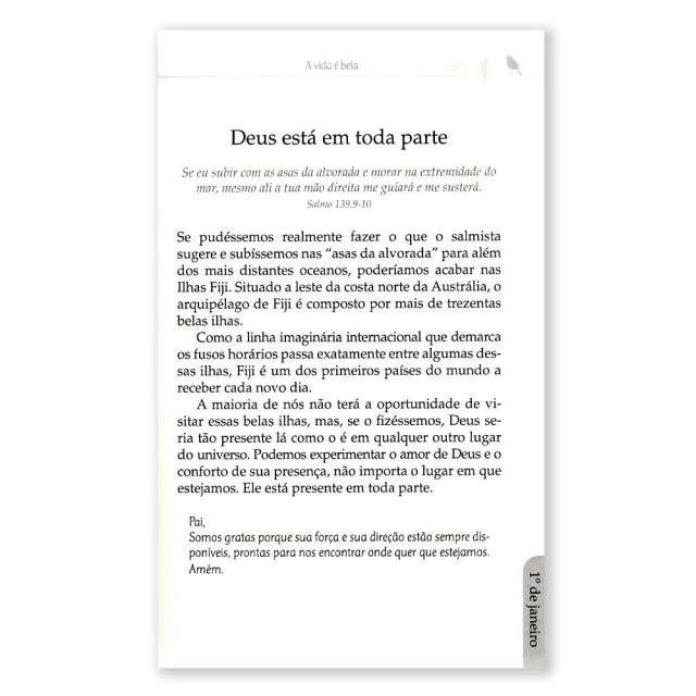 O livro "Devocional A Vida é Bela" da renomada autora Ellen Banks Elwell é uma obra que cativa leitores com sua abordagem inspiradora e profundamente espiritual. Este devocional oferece uma jornada diária de reflexão e meditação, projetada para enriquecer a vida de quem o lê. Com suas mensagens de esperança, gratidão e fé, o livro convida os leitores a apreciarem a beleza que está presente em todos os aspectos da vida cotidiana, independentemente das circunstâncias. Cada página oferece uma oportunidade de conexão com o divino e de cultivar um coração grato. "Devocional A Vida é Bela" é uma escolha inspiradora para aqueles que buscam encontrar significado e propósito em seu dia a dia, tornando-o um presente ideal para compartilhar com amigos e familiares que desejam nutrir sua espiritualidade. Permita que a Palavra de Deus inunde sua alma, levando você a acreditar verdadeeiramente que a Vida É Bela. Com estes devocionais claros e encorajadores você encontrará motivos para se alegrar a cada novo dia. Ellen Banks Elwell escreveu 26 livros que juntos venderam mais de 500.000 cópias. Alguns de seus livros foram traduzidos para alemão, afrikaans, chinês e holandes. Ellen trabalha na publicação internacional em Tyndale House Publishers. Ellen mora em Wheaton, IL, EUA, com seu marido, Jim, desde que se casaram em 1974. Eles têm três filhos adultos, uma nora e dois netos. 15,5x22,5cm 408 Páginas