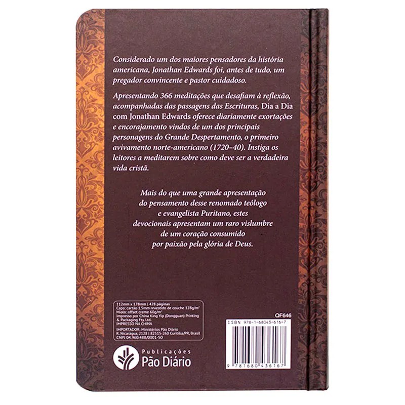 Dia a Dia com Jonathan Edwards, apresenta 366 meditações que desafiam à reflexão, acompanhadas das passagens das Escrituras, oferece diariamente exortações e encorajamento vindos de um dos principais personagens do Grande Despertamento, o primeiro avivamento norte-americano (1720-40). Instiga os leitores a meditarem sobre como deve ser a verdadeira vida cristã. Mais do que uma grande apresentação do pensamento desse renomado teólogo e evangelista Puritano, estes devocionais apresentam um raro vislumbre de um coração consumido por paixão pela glória de Deus. Jonathan Edwards (1703 – 1758): O único filho homem entre 11 crianças do casal Timothy e Esther Edwards. Foi antes de tudo, um pregador convincente e pastor cuidadoso. É conhecido como um dos maiores teólogos e filósofos da história norte-americana e foi um dos precursores da era da expansão missionária protestante no século 18. A vida desse avivalista é um grande exemplo de consagração a Deus no desenvolvimento de seu intelecto, De 1751 a 1757, a convite, Jonathan passou a pastorear a igreja em Stockbridge, e a congregação além de colonos ingleses incluía nativos americanos, com 150 famílias moicanas e mohawks. Em 1758, assumiu o posto de presidente da Universidade de Princeton, mas, alguns meses após sua chegada, contraiu varíola, vindo a falecer em 22 de março de 1758, aos 53 anos. Acabamento: Capa DuraPeso: 0,440 kgDimensões: 11,2 cm x 17,8 cmPáginas: 428