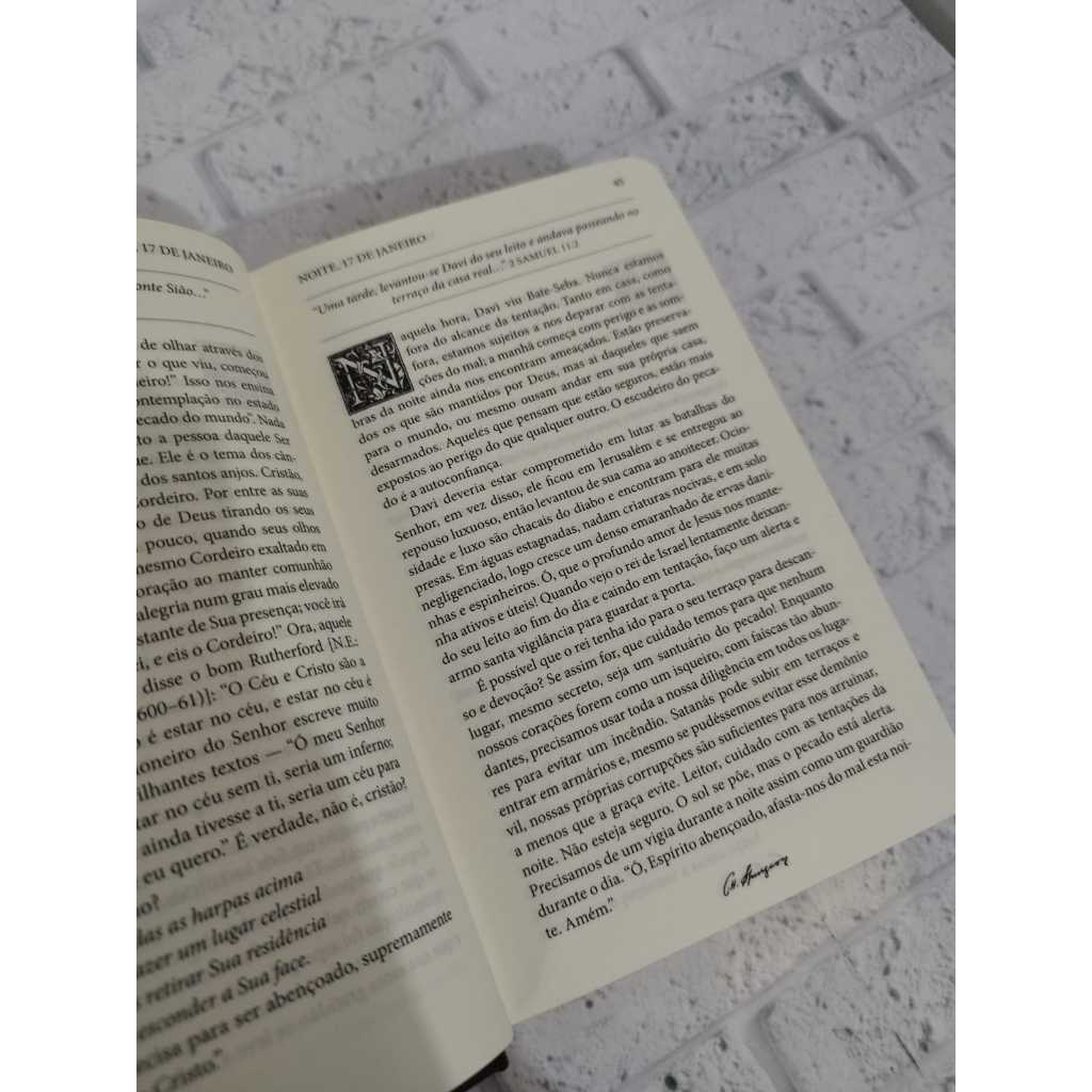 Devocional Dia a dia com Spurgeon Manhã e Noite - Pão Diario Capa Couro Luxo Por mais de um século, o devocional Manhã e Noite permanece como um dos maiores clássicos da literatura cristã. De autoria de Charles H. Spurgeon, aclamado como o “Príncipe dos pregadores”, do século 19, essas meditações conduzem o leitor em uma jornada de aprofundamento no relacionamento com Deus e no conhecimento de Sua Palavra. As inspiradoras meditações, uma para manhã e outra para a noite, desafiam a uma vida de compromisso com o Senhor e Sua amada Igreja. A linguagem muito pessoal que Spurgeon usa dá a cada leitura um tom de conversa íntima entre irmãos. Deleite-se com devocionais edificantes e aproxime-se do seu Criador diariamente! Este é um dos devocionais mais queridos na história da Igreja. Aborda temas com profundidade e de forma prática: Expiação, Eleição, Santificação, Intimidade com Cristo, Vida de oração, Perseverança nas provações. O Estilo adotado por Spurgeon nestes textos é o de uma conversa entre amigos, enquanto se saboreia um delicioso café. Você encontrará: Duas leituras devocionais por dia Índice temático de todas as meditações, Biografia do autor, que esclarece o contexto histórico das mensagens Linguagem atual, porém, preservando-se as características históricas do texto. Conheça melhor seu Salvador e aprofunde-se no conhecimento das verdades bíblicas. Ficha Técnica Título: Devocional Dia a dia com Spurgeon Manhã e Noite Capa Luxo Editora: Pão Diário ISBN: 9781680430004 Formato: 19x12x4 cm