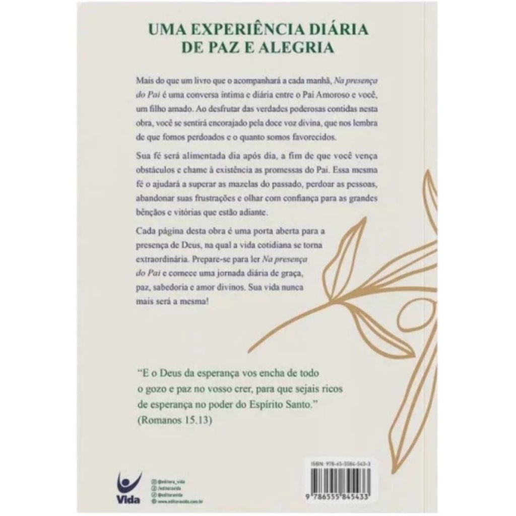 Devocional Na Presença do Pai | Uma Experiência Diária de Paz e Alegria | Naor Pedroza Mais do que um livro que o acompanhará a cada manhã, Na presença do Pai é uma conversa íntima e diária entre o Pai amoroso e você, um filho amado. Ao desfrutar das verdades poderosas contidas nesta obra, você se sentirá encorajado pela doce voz divina, que nos lembra de que fomos perdoados e de quanto somos favorecidos. Sua fé será alimentada dia após dia, a fim de que você vença obstáculos e cumpra os propósitos do Pai. Essa mesma fé o ajudará a superar as mazelas do passado, perdoar as pessoas, abandonar suas frustrações e olhar com confiança para as grandes bênçãos e vitórias que estão adiante. Cada página desta obra é uma porta aberta para a presença de Deus, na qual a vida cotidiana se torna extraordinária. Prepare-se para ler Na presença do Pai e comece uma jornada diária de graça, paz, sabedoria e amor divinos. Sua vida nunca mais será a mesma! Autor: Naor Pedroza Editora: Vida Acabamento: Capa brochura Dimensões: 16 cm largura x 23 cm altura Número de páginas: 384