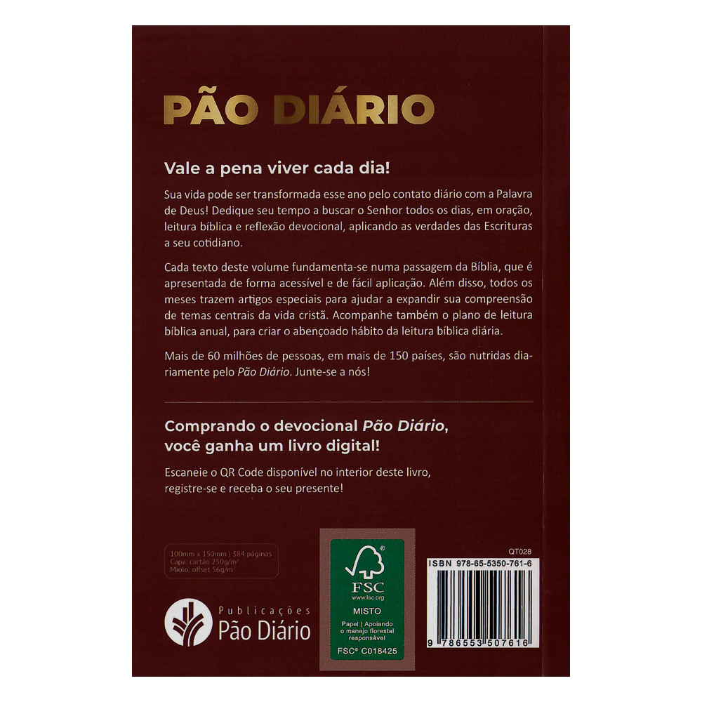 Livro Devocional Pão Diário | Vol. 29 | BordôPão Diário – Devocional para Fortalecer sua Fé e sua Família O Pão Diário é um devocional cristão que oferece 365 reflexões bíblicas para inspirar sua jornada espiritual diária. Com mensagens profundas e acessíveis, este livro ajuda você e sua família a começar o dia com esperança, sabedoria e propósito, fortalecendo a comunhão com Deus e os relacionamentos em casa. Mais do que um simples devocional, o Pão Diário é um guia prático para quem deseja crescer na fé, confiar plenamente no Senhor e viver os princípios da Palavra de Deus. Cada meditação combina ensino bíblico claro com aplicações para o cotidiano, transformando momentos de leitura em experiências de oração, louvor e aprendizado espiritual. Ideal para: Famílias cristãs que buscam devocionais diários edificantes.Indivíduos que desejam uma rotina de fé transformadora.Líderes de grupos pequenos ou células que precisam de material de apoio.Destaques: Um dos devocionais mais vendidos no Brasil, com milhões de exemplares distribuídos.Linguagem clara e aplicação prática, perfeito para todas as idades.Ferramenta essencial para quem quer aprofundar a vida com Deus de maneira consistente.Inicie cada dia com a direção e inspiração que só o Pão Diário pode oferecer. Especificações Técnicas: Título:Devocional Pão Diário | Vol. 29 | BordôAno de Edição:2025Capa:Brochura Acabamento:Laminação BrilhanteMiolo:Papel OffsetPáginas:384Dimensões:Altura: 15 cm Largura: 10,2 cm Profundidade: 1,5 cm Peso:0,178 kgISBN:9786553507616Editora:Editora Pão Diário