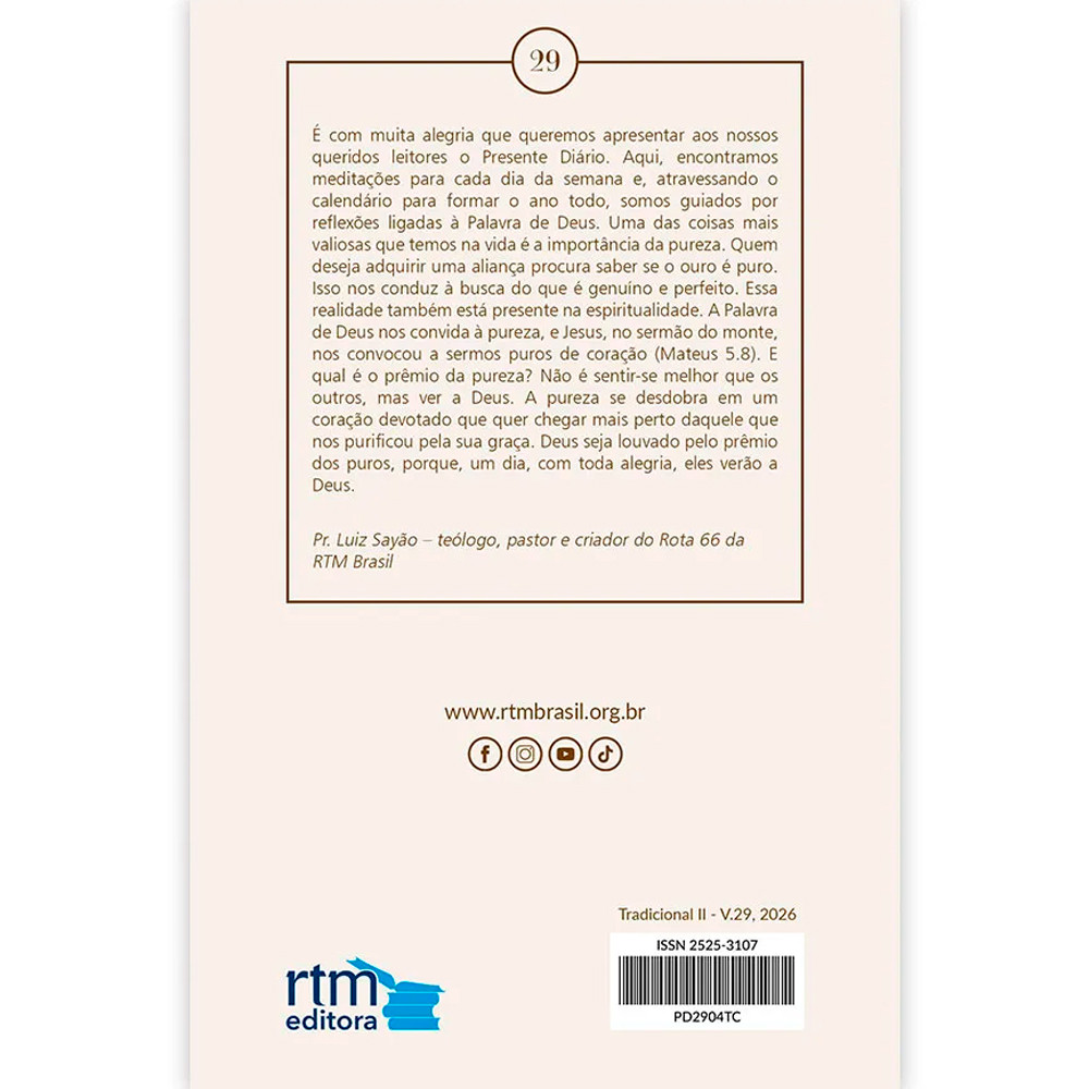 Livro Devocional Presente Diário Mini | Vol 29 | Capa Criança | 2026 Um Devocional Para Aqueles Que Buscam a DeusDiversosApresentamos com alegria o Devocional Presente Diário, uma fonte diária de inspiração e reflexão na Palavra de Deus. Este volume oferece meditações devocionais para cada dia da semana, guiando você em uma jornada espiritual transformadora ao longo de todo o ano de 2026. Inspirado no chamado de Jesus no Sermão do Monte, este devocional tem como tema central a busca por um coração puro e genuíno diante de Deus. Assim como o ouro puro é valioso, a pureza espiritual nos aproxima do Pai e nos capacita a viver uma vida devotada, com o prêmio supremo de, um dia, ver a Deus. Benefícios e Destaques deste Devocional: Disciplina Espiritual Diária: Cultive o hábito de encontrar-se com Deus todos os dias através de reflexões claras e aplicáveis.Tema Inspirador: Medite sobre a importância da pureza de coração, um convite direto de Jesus para uma vida transformada.Jornada Anual Completa: Um conteúdo novo para cada dia, oferecendo orientação e consolo espiritual durante todo o ano de 2026.Fundo Bíblico Sólido: Reflexões profundas e fiéis às Escrituras, que conduzem a um relacionamento mais próximo de Deus.Formato Prático e Acessível: Edição mini com capa delicada (Capa Pombo), perfeita para levar na bolsa ou para seu momento de quietude.Ideal para quem deseja aprofundar sua fé, buscar a Deus diariamente e encontrar propósito e paz em Sua presença. Adquira já o seu Devocional Presente Diário Volume 29 e permita que a Palavra de Deus guie cada dia do seu ano. Especificações do livro Devocional Presente Diário Mini | Vol 29 | Capa Criança | 2026: Título:Devocional Presente Diário Mini | Vol 29 | Capa Criança | 2026Subtítulo:Um Devocional Para Aqueles Que Buscam a DeusAutor(es):DiversosAno de Edição:2025Capa:BrochuraPáginas:365Dimensões:13 x 8 x 2 cmPeso:0,235 gISBN:7894158185398Editora:Rádio Transmundial