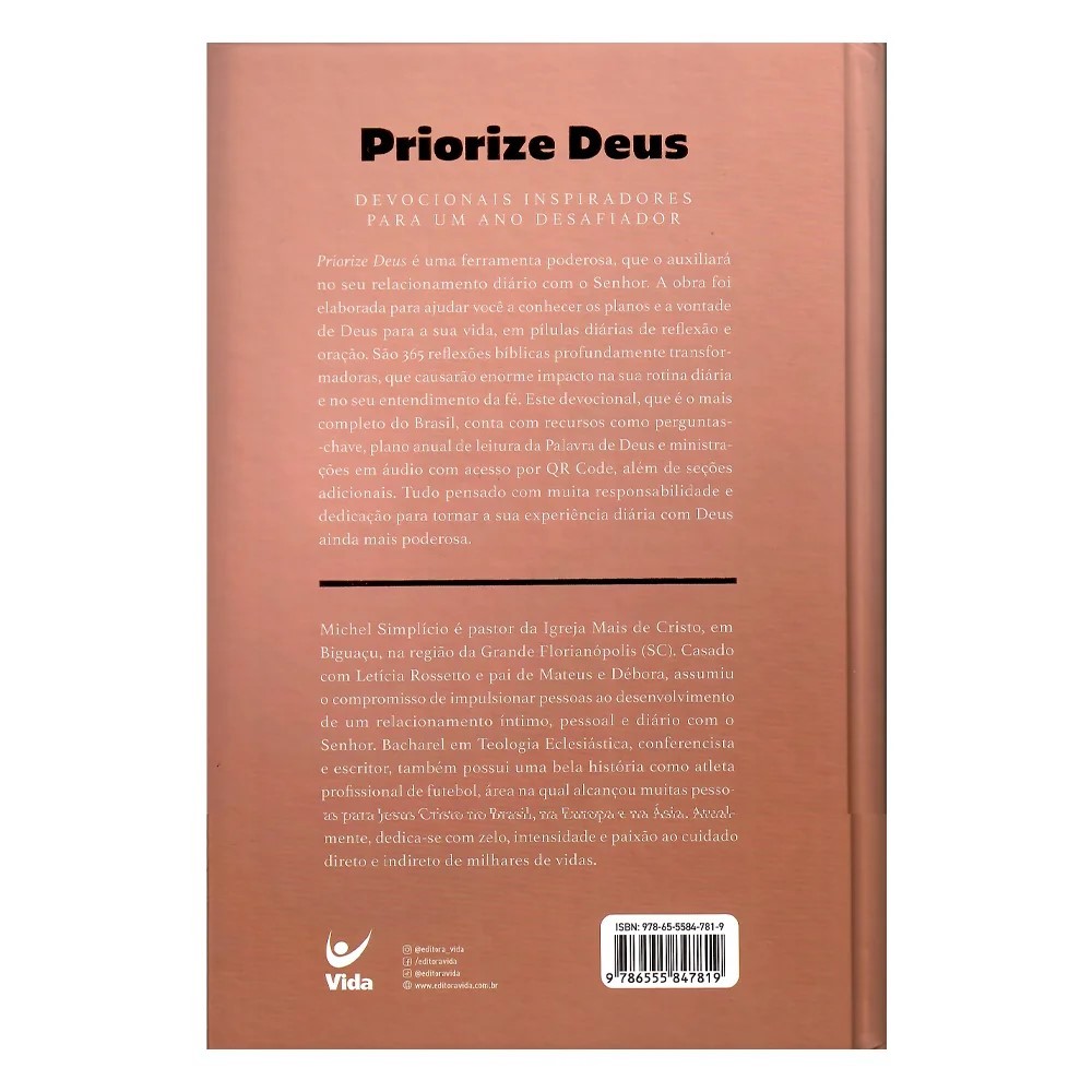 Priorize Deus mocha, edição limitada é uma ferramenta poderosa, que o auxiliará no seu relacionamento diário com o Senhor. A obra foi elaborada para ajudar você a conhecer os planos e a vontade de Deus para a sua vida, em pílulas diárias de reflexão e oração. São 365 reflexões bíblicas profundamente transformadoras, que causarão enorme impacto na sua rotina diária e no seu entendimento da fé. Este devocional, que é o mais completo do Brasil, conta com recursos como perguntas--chave, plano anual de leitura da Palavra de Deus e ministrações em áudio com acesso por QR Code, além de seções adicionais. Tudo pensado com muita responsabilidade e dedicação para tornar a sua experiência diária com Deus ainda mais poderosa. Peso 0.500 Páginas 400 Acabamento Cada Dura Dimensões 16x23 Título da Página Priorize Deus 2026 - Mocha - Edição Limitada EAN 9786555847819