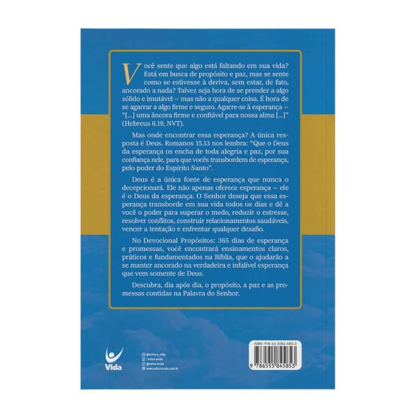 Devocional Propósitos | 365 Dias De Esperança E Promessas | Rick Warren Devocional Propósitos: 365 Dias de Esperança e Promessas é um convite para ancorar sua vida na única esperança que jamais falha: Deus. Se você sente que algo está faltando, como se estivesse à deriva em busca de propósito e paz, este livro é para você. Hebreus 6:19 nos lembra que a esperança em Deus é “[...] uma âncora firme e confiável para nossa alma [...]” (NVT). E em Romanos 15:13, encontramos a promessa de que o Deus da esperança pode enchê-lo de alegria e paz, fazendo sua vida transbordar dessa esperança pelo poder do Espírito Santo. Este devocional diário oferece reflexões claras, práticas e fundamentadas na Palavra, ajudando você a superar medos, reduzir o estresse, vencer tentações e construir relacionamentos saudáveis. A cada dia, você descobrirá promessas e ensinamentos que o fortalecerão para enfrentar os desafios da vida com confiança. Permita que essas 365 meditações guiem seu coração e o mantenham ancorado na verdadeira esperança. Encontre paz, propósito e a renovação diária que só o Senhor pode oferecer, vivendo cada momento sob as promessas infalíveis de Deus. Altura: 2,5 cm Largura: 15,5 cm Profundidade: 2,5 cm 0,510 kg