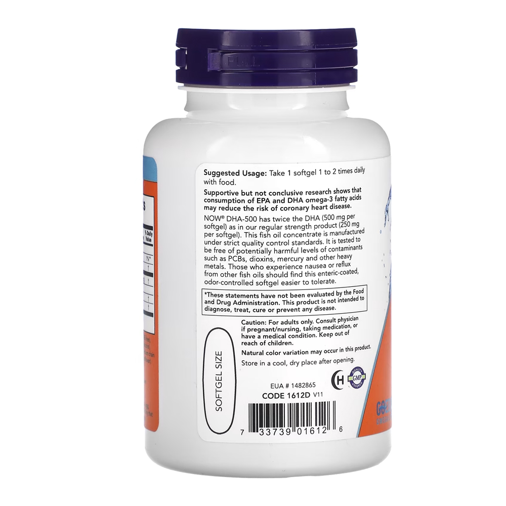 DHA-500 Now Foods 250Epa Óleo de Peixe 90Soft Produto Importado 1. Suporte Principal: DHA-500 da Now Foods é um suplemento de óleo de peixe concentrado, oferecendo 500mg de DHA e 250mg de EPA por cápsula. Este suplemento é formulado para fornecer os ácidos graxos ômega-3 essenciais, conhecidos por seus benesses naturais. 2. Vantagem da Apresentação em Cápsulas Moles: As cápsulas moles facilitam a ingestão e permitem uma absorção eficiente dos ácidos graxos ômega-3. Esta forma de apresentação é ideal para quem busca uma maneira prática de incluir DHA e EPA na dieta. 3. Produto Importado com Disponibilidade Imediata: Este suplemento é importado, assegurando a qualidade e a confiabilidade da Now Foods. Com disponibilidade para pronta entrega, você pode começar a integrá-lo na sua rotina sem demora. 4. Integração Fácil na Rotina Diária: As cápsulas de DHA-500 da Now Foods são fáceis de incluir na sua rotina diária, devido ao seu tamanho compacto e praticidade de consumo, tornando-as uma escolha conveniente para o dia a dia. 5. Composição do Produto: Cada cápsula contém 500mg de DHA (ácido docosa-hexaenoico) e 250mg de EPA (ácido eicosapentaenoico), derivados de óleo de peixe de alta qualidade. O produto é livre de metais pesados e contaminantes, garantindo um suplemento puro e eficaz. VALIDADE LONGA