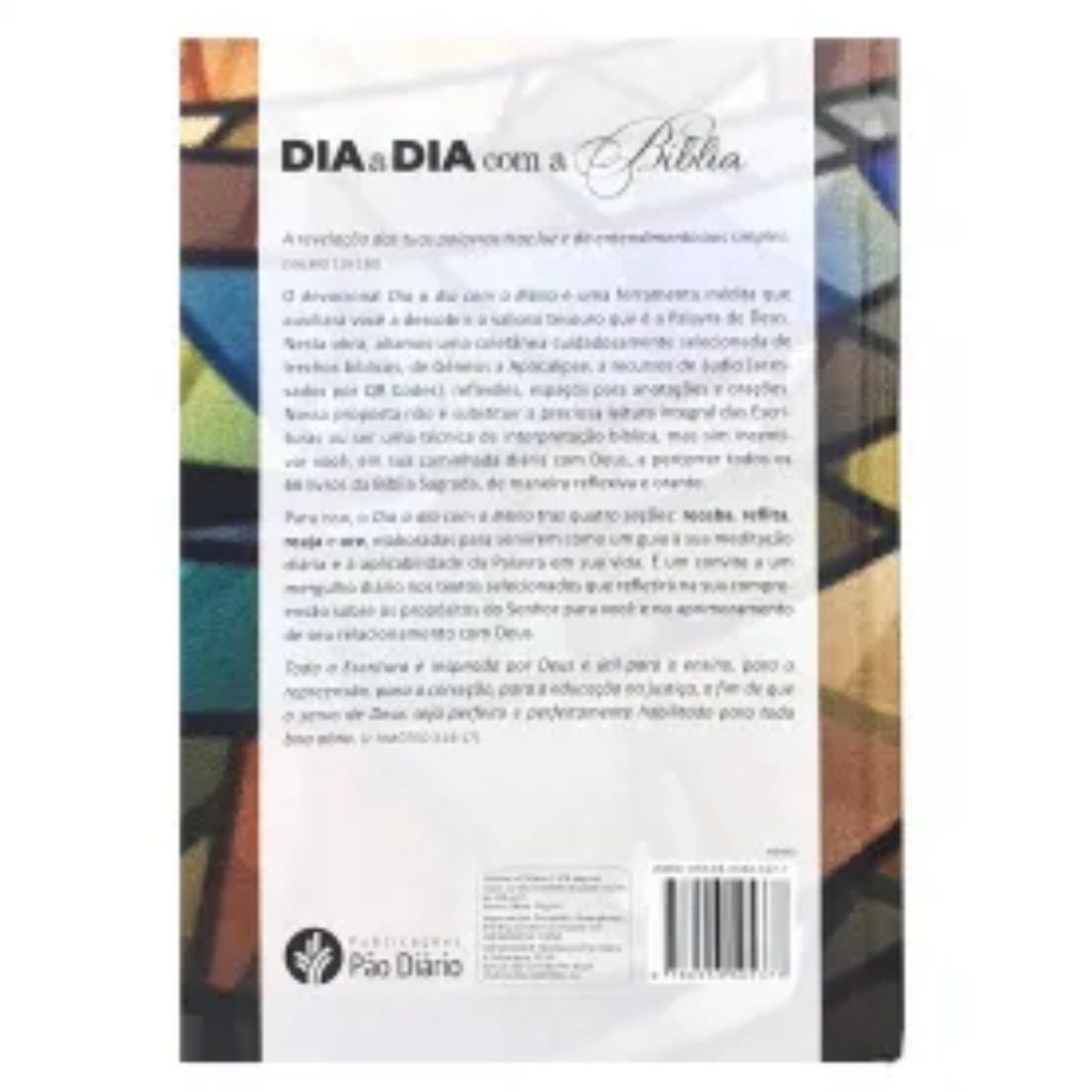 Dia a dia com a Bíblia | Um ano de imersão na Palavra de Deus | Lectio Divina Capa Dura Vitral Oferece porções bíblicas diárias e se inspira no tradicional método de leitura orante para conduzir o leitor em uma jornada de fé. É perfeito para quem está iniciando o hábito da leitura da Bíblia ou deseja uma nova abordagem para refletir nas Escrituras. Traz reflexões acompanhadas das seções Reflita, com perguntas para melhor compreensão do sentido do texto, e Reaja, com aplicações práticas que nos convidam à ação e compromisso com o Senhor. Contém: arquivos de áudio acessíveis via QR Code, trazendo a narração da passagem bíblica do dia; espaço para anotações diárias. Editora: Publicações Pão Diário Acabamento: Capa dura Dimensões: 15 cm largura x 22 cm altura Número de páginas: 376