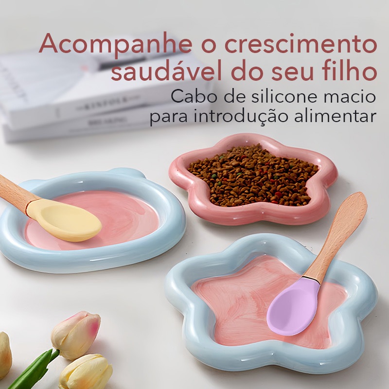 [Dia Das Crianças] Kit De Colher e Garfo de Silicone com Cabo de Madeira Bebe e Mãe