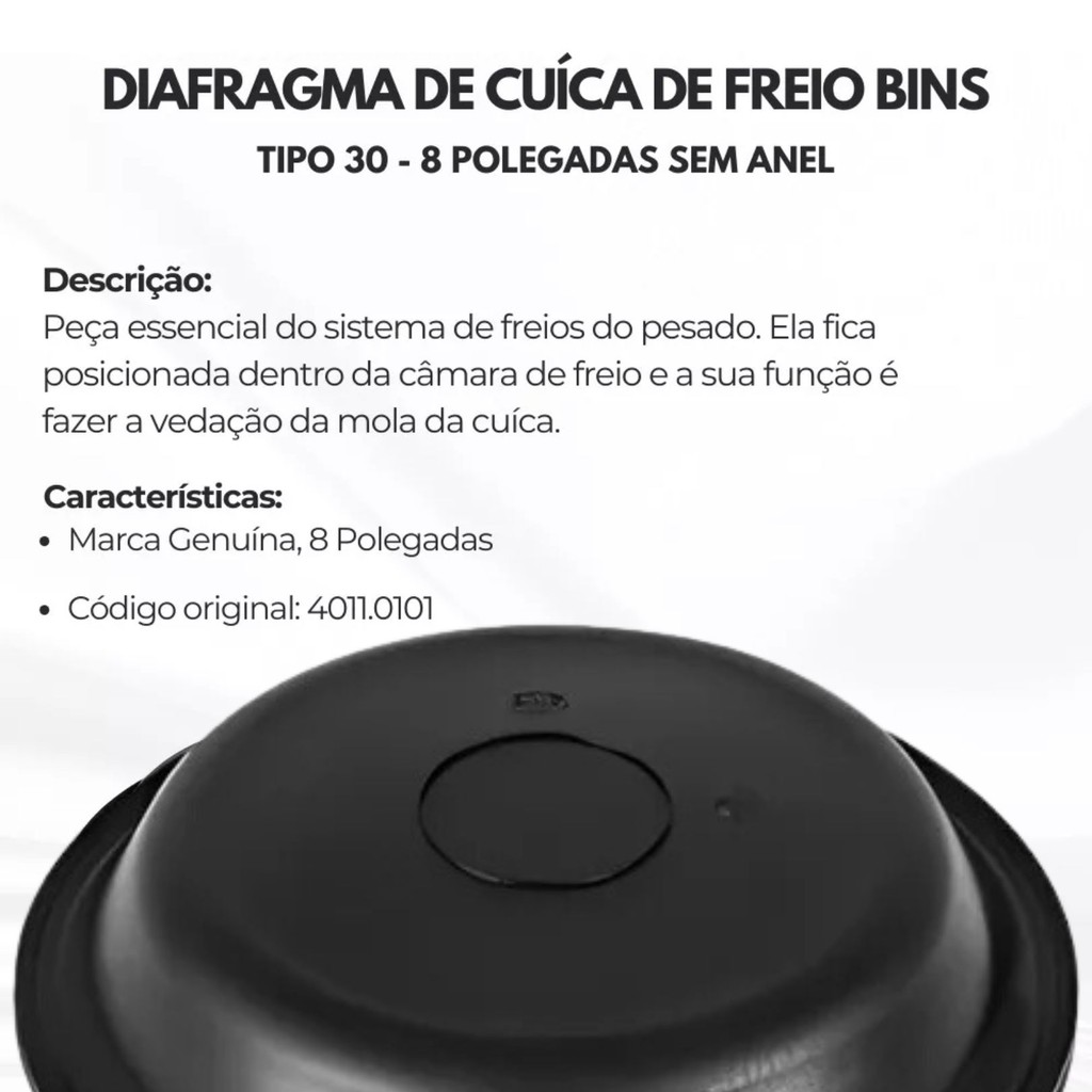 Diafragma de Cuíca de freio TIPO 30 - 8 POLEGADAS SEM ANEL BINS Peça essencial do sistema de freios do pesado. Ela fica posicionada dentro da câmara de freio e a sua função é fazer a vedação da mola da cuíca. Aplicação: Cuícas de Freio 30x30 / 24x30 / 30 - Trucks e Carretas Tipo 30- 8 Polegadas COD. ORIGINAL: Bendix 234101/ DAF 0533891/ Fiat 79850445/ Ford 87HU2325AA/ GM 94636953/ Guerra 5001005036007/ Iveco 07142487/ MAN 90911590013/ MB 008 421 0186/ Neoplan 070211302/ Renault 7701005197/ Scania 0143113/ Setra 8283696686/ Schmitz C. 051043/ Volvo 1588818/ VW TJG607957 Referencia: 4011.0101