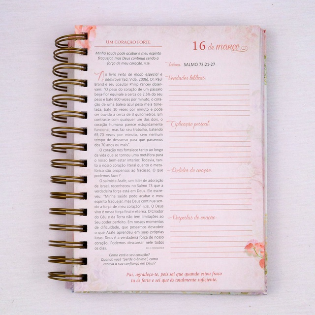 As adversidades muitas vezes nos cercam, fazendo-nos sentir sós e desprotegidas. Mas o bom é saber que o Senhor Deus é o nosso refúgio. Por isso, temos um lugar seguro para onde correr quando a angústia e a dor tomam conta de nós: a presença de Deus! Esse é o melhor lugar para se estar, pois ali recebemos o Seu cuidado em cada detalhe e situação, aconchegadas e protegidas sob Suas asas. Temos a garantia, em todos os momentos, de que Sua forte e segura defesa nos preservará. Que encontremos no Senhor a força e a alegria para enfrentarmos os desafios e lutas diárias. Aproveite para registrar em seu Diário de Oração os momentos de conforto, refrigério e fortalecimento de Deus para a sua vida! Que o Senhor, que está sempre com você, fale ao seu coração através destas reflexões. Contém: – Um plano de leitura anual da Bíblia – Uma meditação para cada dia do ano – Espaços para anotar as verdades bíblicas, a aplicação pessoal, os pedidos e as respostas de oração Detalhes do produto: Editora: Publicações Pão Diário Acabamento: Capa Dura Formato: 15 larg. X 21 alt. Número de Páginas: 392