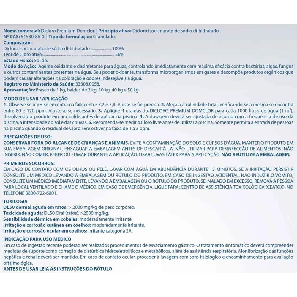 Dicloro Premium com 56% de cloro ativo. Ideal para todos os tipos de piscinas. Cloro de origem orgânica e estabilizado. Modo de Ação: Agente oxidante e desinfetante para águas, controlando imediatamente com eficácia contra bactérias, algas, fungos e outros contaminantes presentes na água. Seu poder oxidante transforma microorganismos em gases e decompõe produtos orgânicos que podem causar alterações na coloração e odores indesejáveis à água. modo de usar / aplicação 1. Observe se o pH se encontra na faixa entre 7,2 e 7,8. Ajuste se for preciso. 2. Meça a alcalinidade total, verificando se a mesma se encontra entre 80 e 120 ppm. Ajuste-a, se necessário. 3. Aplique 4 gramas do dicloro premium para cada 1000 litros de água (1 m³), dissolvendo o produto em um balde antes de aplicar na piscina. 4. A dosagem deverá ser ajustada de acordo com a frequência de uso da piscina, a intensidade do sol e das chuvas. 5. Recomenda-se medir o Cloro livre antes de utilizar a piscina. Somente permita a entrada de pessoas na piscina quando o residual de Cloro livre estiver na faixa de 1 a 3 ppm. Sanitizante granulado de origem orgânica. Mantém o cloro por maior tempo na água devido ao estabilizador existente em sua estrutura. Característica que agiliza o tempo de homogeneização com total dissolução. Não gera resíduo. Oxida as matérias orgânicas da água imediatamente. Elimina as bactérias que prejudicam a qualidade da água. Ideal para todos os tipos de piscinas e águas, inclusive as com alto teor de calcário.