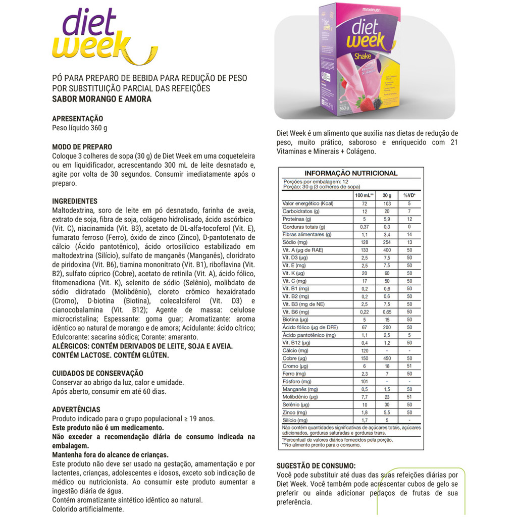 Somos uma Distribuidora que está há mais de 5 anos no mercado, oferecendo produtos originais com procedência e garantia de fábrica. Com suplementos e nutracêuticos formulados com ingredientes de alta qualidade proporcionam resultados eficazes para saúde e bem-estar. Tenha mais energia, imunidade e disposição com nossos produtos. Conheça nossa linha completa! Pode ser utilizado para substituir até duas refeições diárias e pode ser consumido com cubos de gelo e pedaços de frutas de sua preferência. Modo de preparo: Coloque 3 colheres de sopa (30g) de Diet Week em uma coqueteleira ou em um copo de liquidificador. Adicione 300ml de leite desnatado. Agite por volta de 30 segundos e está pronto para consumo. Ingredientes: Maltodextrina, soro de leite em pó, leite em pó desnatado, farinha de aveia, extrato de soja, fibra de soja, colágeno hidrolisado, mix de vitaminas e minerais: ácido fólico, biotina, cálcio, cromo, cobre, ferro, fósforo, iodo, magnésio, manganês, potássio, selênio, silício, vitamina A, vitamina B1, vitamina B2, vitamina B3, vitamina B5, vitamina B6, vitamina B12, vitamina C, vitamina D3, vitamina E e zinco, espessante: goma guar, aromatizante idêntico ao natural de morango, corante vermelho bordeaux, estabilizante: citrato de sódio dihidratado, edulcorantes artificiais: sucralose, acessulfame e sacarina. Conservação: Manter o produto bem fechado em local fresco, seco e ao abrigo da luz solar. Após aberto, mantenha a embalagem bem fechada. Advertência: Gestantes, nutrizes, crianças, adolescentes e idosos somente devem consumir este produto sob orientação de nutricionistas ou médico. Consumir este produto conforme a recomendação de ingestão diária constante da embalagem. Autorização Ministério da Saúde 6.05821-8 Farmacêutico Responsável CRF/PR 13.469