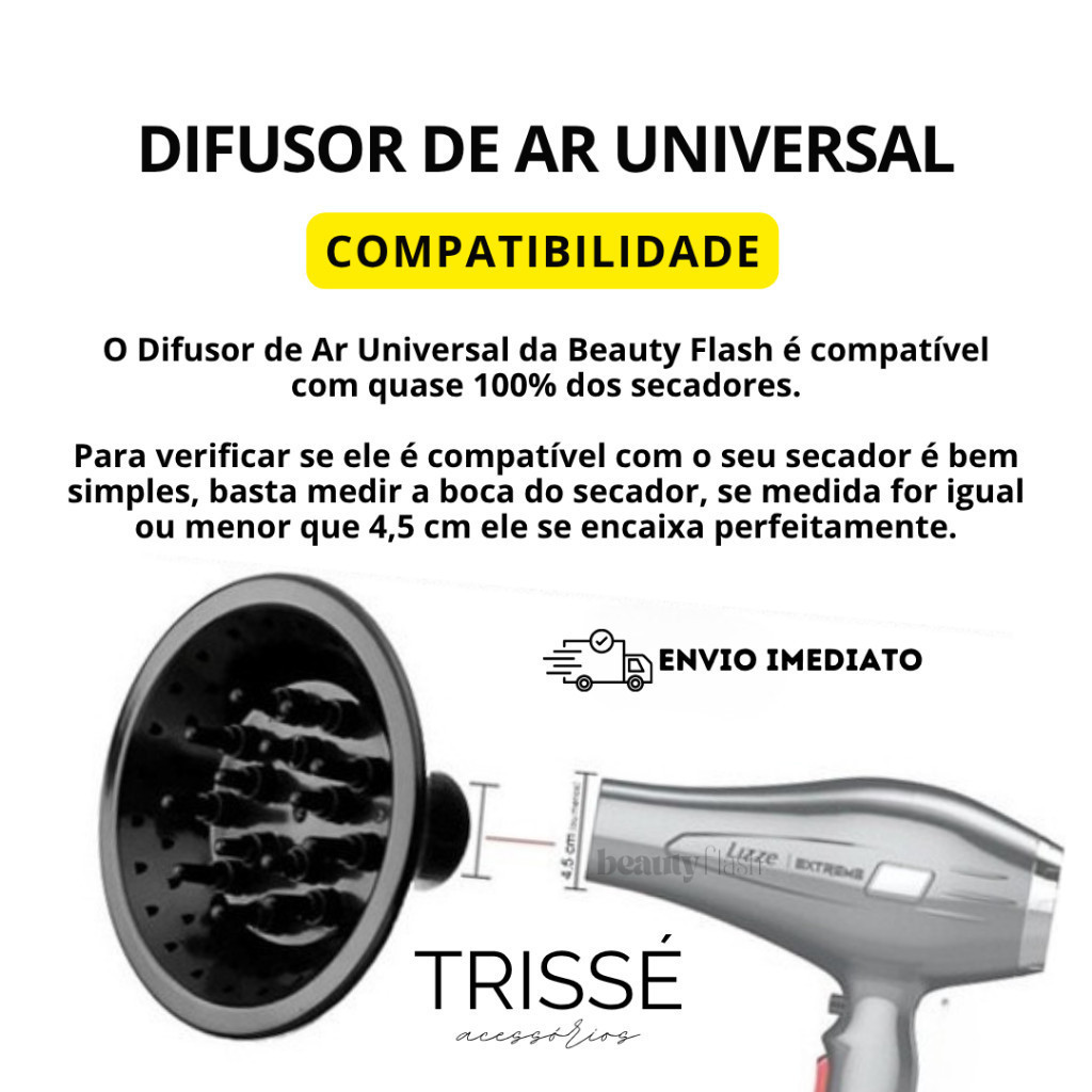 ENVIO IMEDIATO! >>> COMPATÍVEL COM SECADORES COM BOCAL ATÉ 4,5cm <<< Veja aqui abaixo na descrição e nas imagens, a lista de secadores compatíveis e como medir seu secador caso ele não esteja na lista. Se ficar em dúvida nos chame via chat. DIFUSOR DE AR para Secador de Cabelo Universal Beauty Flash. Especialmente desenvolvido para facilitar a realização de vários tipos de penteados, distribui uniformemente o ar na temperatura desejada, seca e massageia em contato com o couro cabeludo. Cria volume rapidamente, seca e modela. Diâmetro de entrada do secador até 4,5cm. >> Veja a LISTA DOS PRINCIPAIS MODELOS compatíveis no final dessa descrição! BENEFÍCIOS: - Modela facilmente os cabelos - 60 saídas de ar para distribuição do calor de forma uniforme - Cria volume rapidamente - Seca e modela - Material resistente e durável CONTEÚDO: 01 unidade de difusor * imagens que contenham o secador são meramente ilustrativas FICHA TÉCNICA: Dimensões aproximadas: Diâmetro do difusor 17 cm Diâmetro externo do encaixe 4,55 cm Composição: ABS resistente ao calor do secador PRINCIPAIS MODELOS DE SECADOR COMPATÍVEIS: TAIFF Smart 1300W, Smart 1700W, New Smart 1700W, Easy 1700W, Red Ion1900W, Tourmaline, Ion, Ceramic 2000W, Fox Ion 2000W, RS5 2000W, Black Iom 2000W, Style 2000W, Foxs Ion 2100W, Titanium 2100W, Eco 2100W, Kompress 2100W, Unique Duo e Fox3 Ion 2200W PHILCO Style e Beauty Style GAMA ITALY Eleganza 2200, Eleganza 2300, Ceramic Ion, Modelo Vibrant, Aura Titanium Ion e Potenza Ceramic Ion LIZZE Todos os modelos – exceto o modelo Compact MALLORY Ion Pro 4000 Se o seu secador NÃO ESTÁ NA LISTA meça o bocal, se a medida for igual ou inferior a 4,5cm o seu secador é compatível. FAQ – Dúvidas frequentes - Todos nossos produtos são inspecionados antes do envio; - Após a separação, todos os pedidos passam por conferência antes de serem embalados; - Devido a visualização mobile ou desktop, as cores podem sofrer varação de tons; - As dimensões dos produtos são aproximadas, podendo sofrer leve variação em decorrência do instrumento de medição; - As imagens dos produtos são ilustrativas, atente as informações da descrição como: descrição de conteúdo e ficha técnica do produto; Não encontrou sua dúvida aqui, NOS CHAME VIA CHAT, respondemos em poucos minutos.
