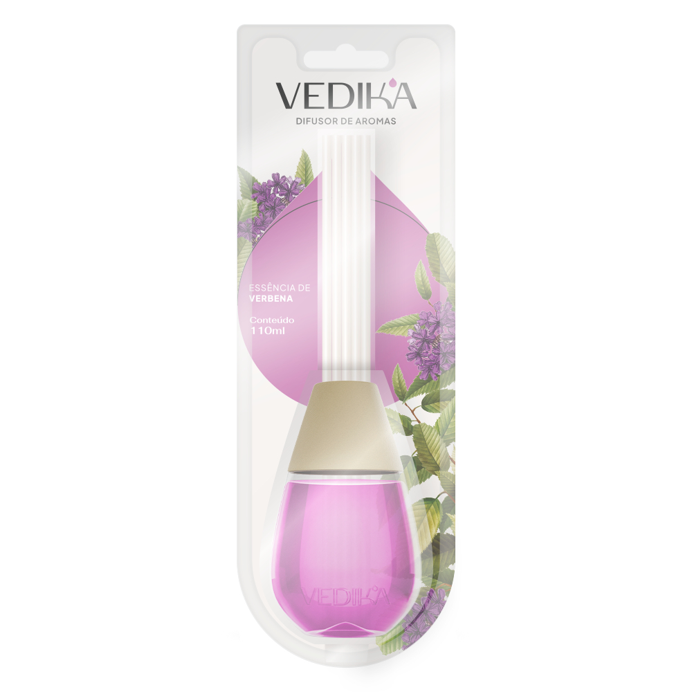O difusor de aromas Vedika apresenta 4 variações de fragrâncias que proporcionam um ambiente mais agradável, aconchegante e confortável para você e suas visitas. Além de ajudar na sua rotina de autocuidado e bem-estar. Em frasco de 110ml, com design diferenciado e discreto, o difusor de aromas Vedika pode ser utilizado em sua casa, no seu ambiente de trabalho e até em estabelecimentos comerciais. - Difusor de Aromas Vedika – Lavanda: fragrância marcante e suave, com ativos calmantes e purificantes, trazendo benefícios relacionados à relaxamento, refrescância e bem-estar. Ideal para quem quer trazer uma sensação de mais tranquilidade para o ambiente. - Difusor de Aromas Vedika – Capim Limão: uma das fragrâncias mais populares e leves, reconhecido por seus atributos relacionados à estimulação da concentração e criatividade. Pode ficar ótimo naquele ambiente que pede dinamismo e mais atenção às tarefas do dia a dia. - Difusor de Aromas Vedika – Verbena: fragrância silvestre e vibrante, vai espalhar frescor e alegria ao ambiente. Suas visitas não vão poupar elogios ao aroma da sua casa. - Difusor de Aromas Vedika – Castanha: fragrância mais sóbria, com notas que estimulam a criatividade e promovem a concentração. Ideal para quem quer um aroma gostoso e discreto no ambiente. MODO DE USO: Abra o frasco e insira as varetas para difusão do perfume. Diariamente vire as varetas deixando o lado molhado exposto para que haja a evaporação da fragrância. Dica: para ter a melhor percepção da fragrância, priorize a utilização em ambientes menores, quentes e com ventilação; já em ambientes maiores, frios e com baixa ventilação a fragrância ficará mais “diluída” no ambiente e assim a sensação de que ela está mais fraca. Nestes casos, você pode utilizar dois difusores do mesmo aroma para reforçar a sua presença olfativa. INGREDIENTES: - Difusor de Aromas Vedika – Lavanda: Alcohol (Álcool Etílico), Parfum (Fragrância), (Citronellol/Citronelol, Coumarin/Cumarina, Linalool/Linalol, Butylpheny Methylpropional/Butilfenil Metilpropional). Aqua (Água), CI17200, CI42090. - Difusor de Aromas Vedika – Capim Limão: Alcohol (Álcool Etílico), Parfum (Fragrância), (Citral/Citral, Geraniol, D-Limonene/Limoneno), Aqua (Água), CI42090, CI19140. - Difusor de Aromas Vedika – Verbena: Alcohol (Álcool Etílico), Parfum (Fragrância) (Amyl Cinnamal/ Amil Cinamal, Citral/ Citral, Geraniol/ Geraniol, Hexyl Cinnamal/Hexil Cinamal, Hydroxyisohexyl 3-Cyclohexene Carboxaldehyde/ Hidroxiisoexil 3-Cicloexeno Carboxaldeído, D-Limonene/Limoneno), Aqua (Água), CI17200, CI42090. - Difusor de Aromas Vedika – Castanha: Alcohol (Álcool Etílico), Parfum (Fragrância) (Hydroxycitronellal/ Hidroxicitronelal, Hydroxyisohexyl 3-Cyclohexene Carboxaldehyde/ Hidroxiisoexil 3-Cicloexeno Carboxaldeído, Butylphenyl Methylpropional/ Butilfenil Metilpropional), Aqua (Água), CI16255, CI19140.