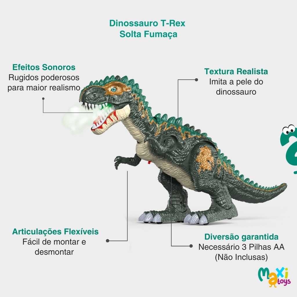Dinossauro de Brinquedo Solta Fumaça e Emite Som Dino Rex - Maxi Toys Prepare-se para mergulhar em uma aventura pré-histórica com o incrível Dino REX da Maxi Toys! Com design inspirado em um poderoso Tiranossauro, este brinquedo promete encantar os pequenos com movimentos realistas, sons impressionantes e funções especiais que tornam a brincadeira muito mais envolvente. Produzido com material super resistente, o Dino REX possui textura realista que imita a pele do animal com detalhes marcantes. Seu grande diferencial está nas funções exclusivas: ele solta fumaça pela boca e bota ovos de verdade, surpreendendo e divertindo ainda mais as crianças. Graças às suas articulações flexíveis, o dinossauro não apenas se movimenta automaticamente, como também balança a cauda, o pescoço, as pernas e os braços, garantindo movimentos incrivelmente realistas que transportam as crianças direto para a era dos dinossauros. Necessário 3 pilhas AA (não inclusas). Mais do que um brinquedo, o Dino REX é uma experiência completa que estimula a criatividade, coordenação motora e a interação social, garantindo longas horas de diversão para toda a família, transformando a brincadeira em uma aventura pré-histórica inesquecível. Principais Características: - Idade Recomendada: A Partir de 3 anos - Design realista inspirado no T-Rex - Textura Realista com Detalhes Marcantes - Boca com efeito em LED e fumaça - Bota Ovos de Verdade - Efeitos sonoros de rugidos poderosos para maior realismo - Cauda Flexível que se Mexe Sozinha - Articulações Móveis e Flexíveis para Movimentos Naturais - Fácil de montar e desmontar - Material ABS resistente e atóxico, seguro para as crianças - Estimula a Criatividade, Coordenação Motora e Interação Social - Necessário 3 Pilhas AA 1,5V (Não Inclusas) - Aprovado Pelo INMETRO Especificações Técnicas: - Conteúdo da Embalagem: 1 Dinossauro de Brinquedo T-Rex Maxi Toys - Dimensões do Produto (AxLxC): 31,0 x 16,0 x 40,0 - Composição/Material: Plástico ABS - Alimentação: 3 Pilhas AA 1,5v (Não Inclusas) - Peso do Produto: 0,475kgs - Garantia: 90 dias (Contra Defeitos de Fabricação Pelo Fabricante) - Certificação: INMETRO 009732/2024 - Código do Fabricante: 21869 - EAN: 7899403218692 - Marca: Maxi Toys Imagens Meramente Ilustrativas. As cores e estampas podem variar de acordo com o lote do fabricante.