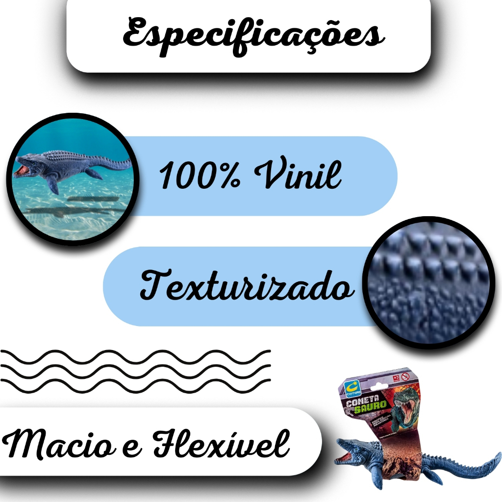 A DC Brinquedos tem a missão de garantir a satisfação total do seu cliente, tanto nos produtos quanto no atendimento. Assim estabelecendo uma relação de confiança! Estamos sempre a disposição para tirar qualquer duvida. ------------------------------------------------------ O brinquedo mosassauro super realista feito de vinil é uma impressionante peça de brinquedo que irá encantar qualquer criança que goste de criaturas marinhas. Este brinquedo é meticulosamente detalhado, com características fielmente reproduzidas a partir de um dinossauro real. Feito de vinil durável, o corpo do Mosassauro é macio e flexível, permitindo que as crianças o apertem sem danificá-lo. Sua pele texturizada e pintada à mão é notavelmente semelhante à pele de um dinossauro real, com padrões de manchas e linhas detalhadas que dão uma aparência ainda mais autêntica. Os dentes afiados do Dino Mosassauro são claramente visíveis e parecem prontos para morder, enquanto as barbatanas na parte superior e inferior do corpo dão um toque extra de realismo ao brinquedo. As crianças vão adorar fazer o Mosassauro nadar pela água ou fingir que estão explorando o oceano em busca de presas. Marca: Cometa Brinquedos. Idade recomendada: A partir de 3 anos. Certificação do INMETRO: Sim Cor: Pode variar com a imagem apresentada. Imagens meramente ilustrativas. Conteúdo da Embalagem: 1 Dinossauro Mosassauro Realista. Material: 100% Vinil Dimensões Aprox. do produto (cm) - AxLxC: 7 cm X 11 cm X 29 cm. Dimensões Aprox. da embalagem - AxLxC 10 x 15 x 28 cm. Garantia do Fornecedor: 3 meses. Referência do Modelo:59. Código de Barras:7898644471880. ---------------------------- Aguardamos seu pedido! Obrigado pela Preferencia!