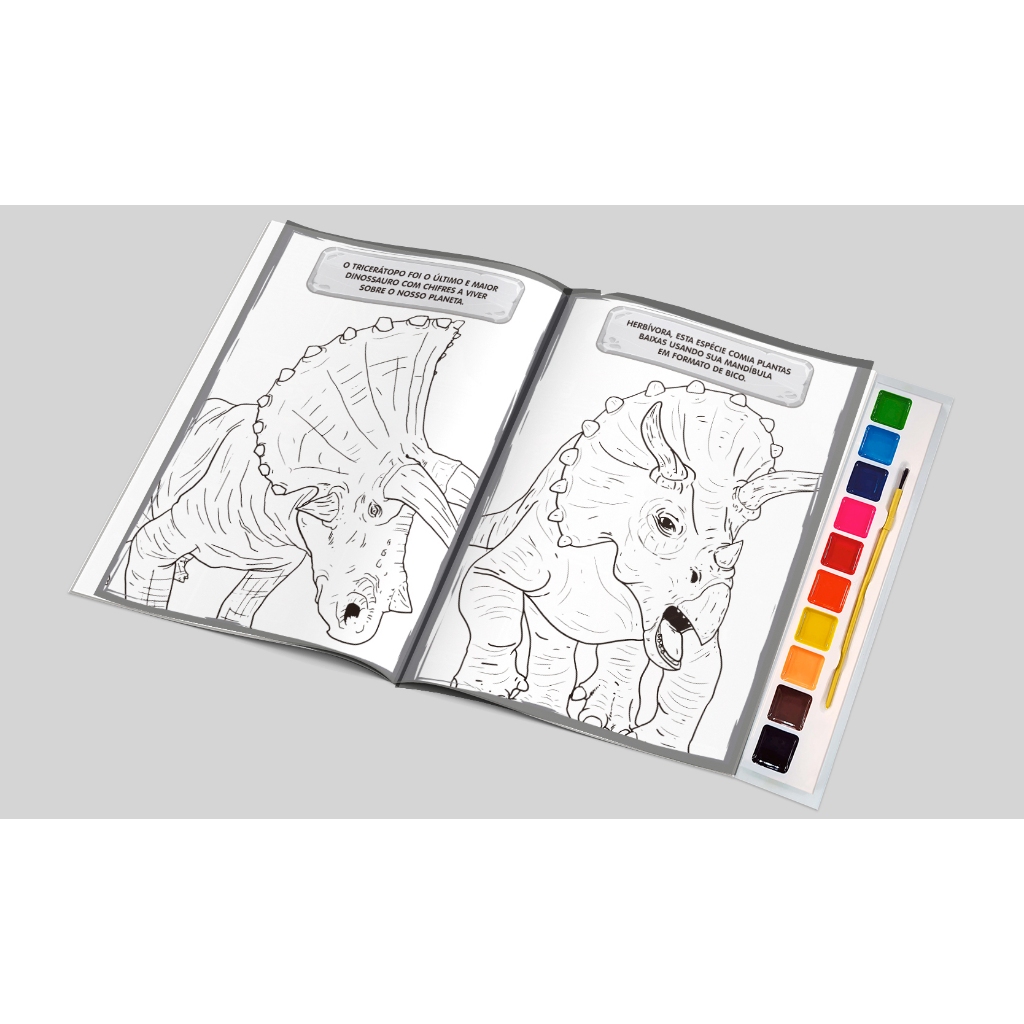 Junte-se aos dinossauros mais irados da era pré-histórica em incríveis páginas para colorir e se divertir de montão. Acompanha aquarela e pincel para completar a brincadeira!
