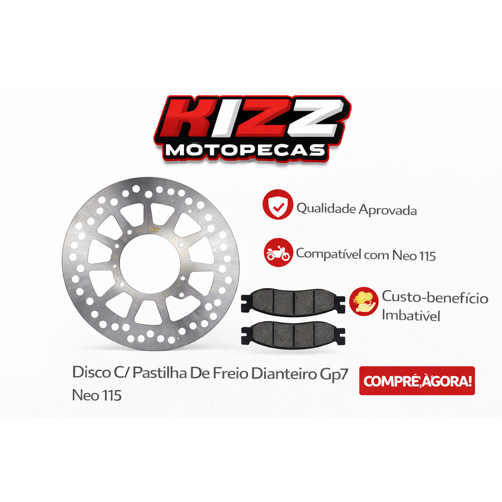 O Conjunto Dianteiro GP7 (Disco + Pastilha) foi desenvolvido para oferecer frenagem eficiente, resposta rápida e durabilidade superior à sua Yamaha Neo 115. Ideal para uso urbano diário, o kit proporciona controle estável nas desacelerações, redução de ruídos e desgaste uniforme, aumentando a segurança e o conforto na pilotagem. O disco é fabricado em aço carbono usinado de alta resistência, garantindo excelente dissipação de calor e resistência ao empenamento. As pastilhas são produzidas com composto otimizado, resultando em atrito consistente, frenagem estável mesmo em condições adversas e vida útil prolongada. Dados Técnicos (aproximados): Material do disco: Aço carbono usinado Diâmetro externo: 220 a 240 mm Espessura do disco: 3,5 a 4,0 mm Peso do disco: 0,65 a 0,90 kg Tipo da pastilha: Semimetálica reforçada Peso do par de pastilhas: 100 a 150 g Peso total do kit (disco + pastilha): 0,8 a 1,05 kg(Especificações podem variar conforme lote de fabricação.) Compatibilidade: Yamaha Neo 115 (modelos compatíveis com montagem dianteira GP7) Benefícios do Kit GP7: Frenagem mais firme e segura Excelente dissipação de calor Redução de ruídos e vibrações Desgaste uniforme das pastilhas Encaixe perfeito para reposição do sistema original Por que comprar na Kizz Moto Peças: Produtos originais ou de alta qualidade comprovada Envio rápido e seguro para todo o Brasil Atendimento especializado para orientar a escolha correta Suporte antes e após a compra Garanta agora o Disco com Pastilha de Freio Dianteiro GP7 para Neo 115 e tenha frenagem eficiente, segurança e confiança em cada parada. Imagens Meramente Ilustrativas