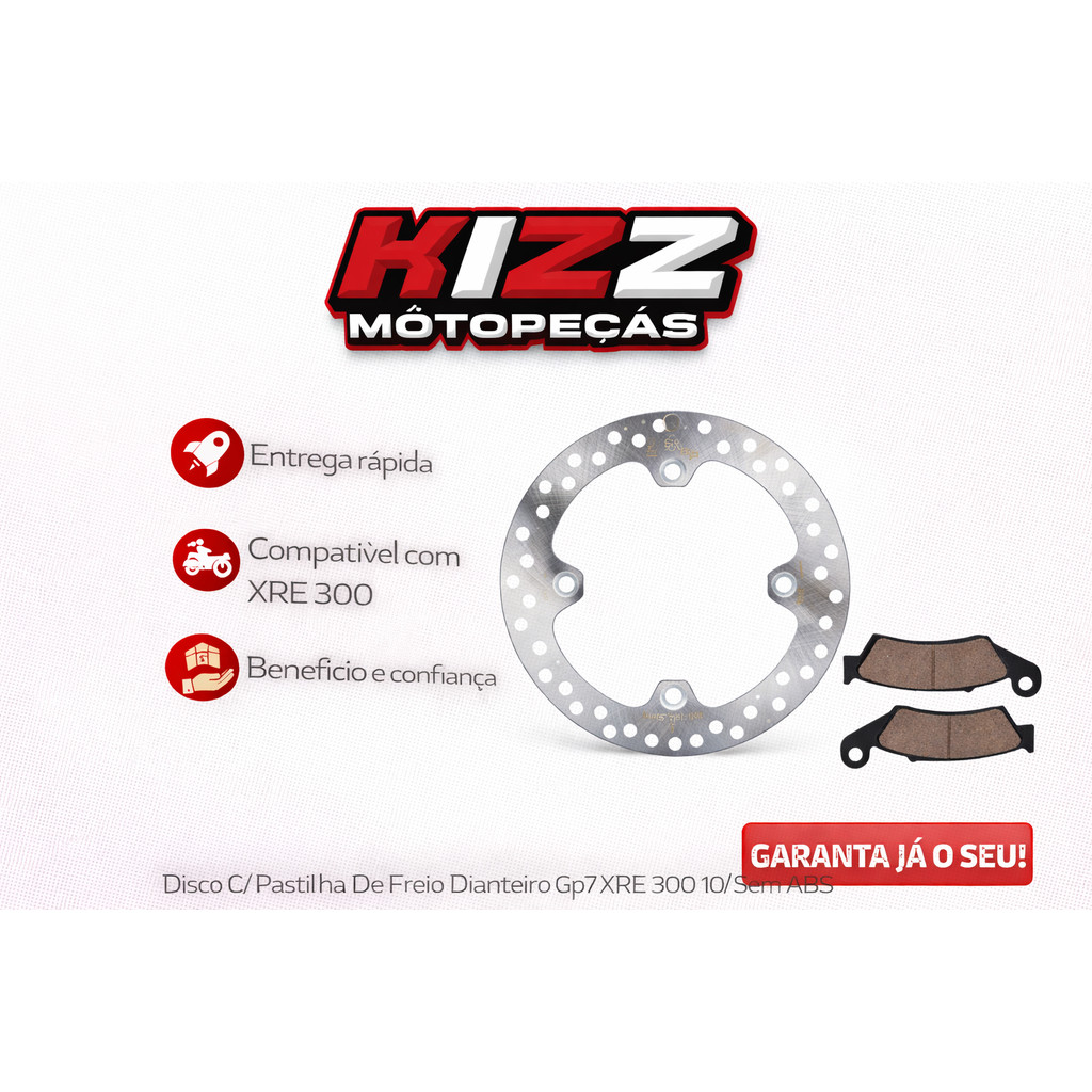O Conjunto Dianteiro GP7 (Disco + Pastilha) foi projetado para oferecer frenagem eficaz, controle seguro e durabilidade prolongada à sua Honda XRE 300 sem sistema ABS, modelos a partir de 2010. Ideal para uso urbano, estradas e trilhas leves, este kit garante resposta precisa ao frear, menor ruído durante a frenagem e desgaste uniforme das pastilhas, proporcionando maior segurança e confiança em cada parada. O disco é fabricado em aço carbono usinado de alta resistência, garantindo excelente dissipação de calor e robustez contra empenamento, mesmo em frenagens repetidas. As pastilhas possuem composto otimizado que oferece frenagem estável, baixa emissão de ruído e vida útil prolongada, mesmo sob uso exigente. Dados Técnicos (aproximados): Material do disco: Aço carbono usinado Diâmetro externo: 240 a 260 mm Espessura do disco: 4,0 a 4,5 mm Peso do disco: 0,80 a 1,05 kg Tipo da pastilha: Semimetálica reforçada Peso do par de pastilhas: 120 a 180 g Peso total do kit (disco + pastilha): 1,0 a 1,3 kg(Especificações podem variar conforme lote de fabricação.) Compatibilidade: Honda XRE 300 – 2010 em diante (sem ABS) Benefícios do Kit GP7: Frenagem firme, estável e eficiente Excelente dissipação de calor Redução de vibrações e ruídos ao acionar o freio Desgaste uniforme para maior vida útil Encaixe preciso para substituição do conjunto original Por que comprar na Kizz Moto Peças: Produtos originais ou de alta qualidade comprovada Envio rápido e seguro para todo o Brasil Atendimento especializado para ajudar na escolha correta Suporte confiável antes e depois da compra Garanta o Disco com Pastilha de Freio Dianteiro GP7 para XRE 300 (sem ABS) e tenha frenagem eficiente, segurança e controle total em suas pilotagens. Imagens Meramente Ilustrativas