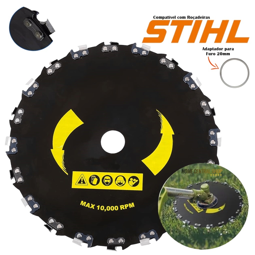 Disco Com Corrente De Motosserra Para Roçadeira Stihl Fs80 / 85 /120 / 160/ 220/ 280/ 290 Compatível com outras roçadeiras: Tekna, Husqvarna,Toyama, Matsuyama, Terra, Vulcan, Nakan, Branco, FortG, Kawashima, Lira, Gama, Yamasaki, Brutate, Yamasaki, Nakasaki, Garthen, Intech Machine, Ferrari, Entre outras. Transforma sua roçadeira em uma ferramenta de corte de madeira mais potente. O disco com dente de corrente é um acessório para roçadeiras que transforma a máquina em uma espécie de motosserra, permitindo cortar arbustos grossos e vegetação densa de forma rápida e eficiente, usando dentes de corrente de motosserra rebitados em uma lâmina circular de aço, comumente usada em roçadeiras a gasolina. - Aplicações: Ideal para cortar tocos, galhos, raízes superficiais, arbustos pesados e abrir mata onde lâminas comuns não dão conta. - Composição: Consiste em dentes reais de corrente de motosserra fixados em uma lâmina circular de aço. - Material: Fabricado em aço carbono de alta qualidade. - Desempenho: Proporciona cortes rápidos, precisos e com menos esforçofísico. Principais características: - Diâmetro: 230mm - Espessura: 2mm - Diâmetro do furo: 25,4mm. Acompanha redutor para 20mm - Velocidade máxima: 10000rpm - Numero de dentes: 20 Segurança e Uso: - Sentido de Rotação: O disco possui um lado específico para corte; a instalação incorreta impede o funcionamento e pode ser perigosa. - Máquinas Recomendadas: Não é indicado para aparadores elétricos leves; deve ser usado em roçadeiras com boa potência para evitartravamentos. - Manutenção: Os dentes podem ser afiados com uma lima específica para corrente de motosserra. PRODUTO A PRONTO ENVIO! Ainda está com dúvida? Nos envie sua pergunta no chat, nossa equipe estará pronta para tirar as suas dúvidas. ok. Sua satisfação é o nossocompromisso! Aguardamos sua compra! :)
