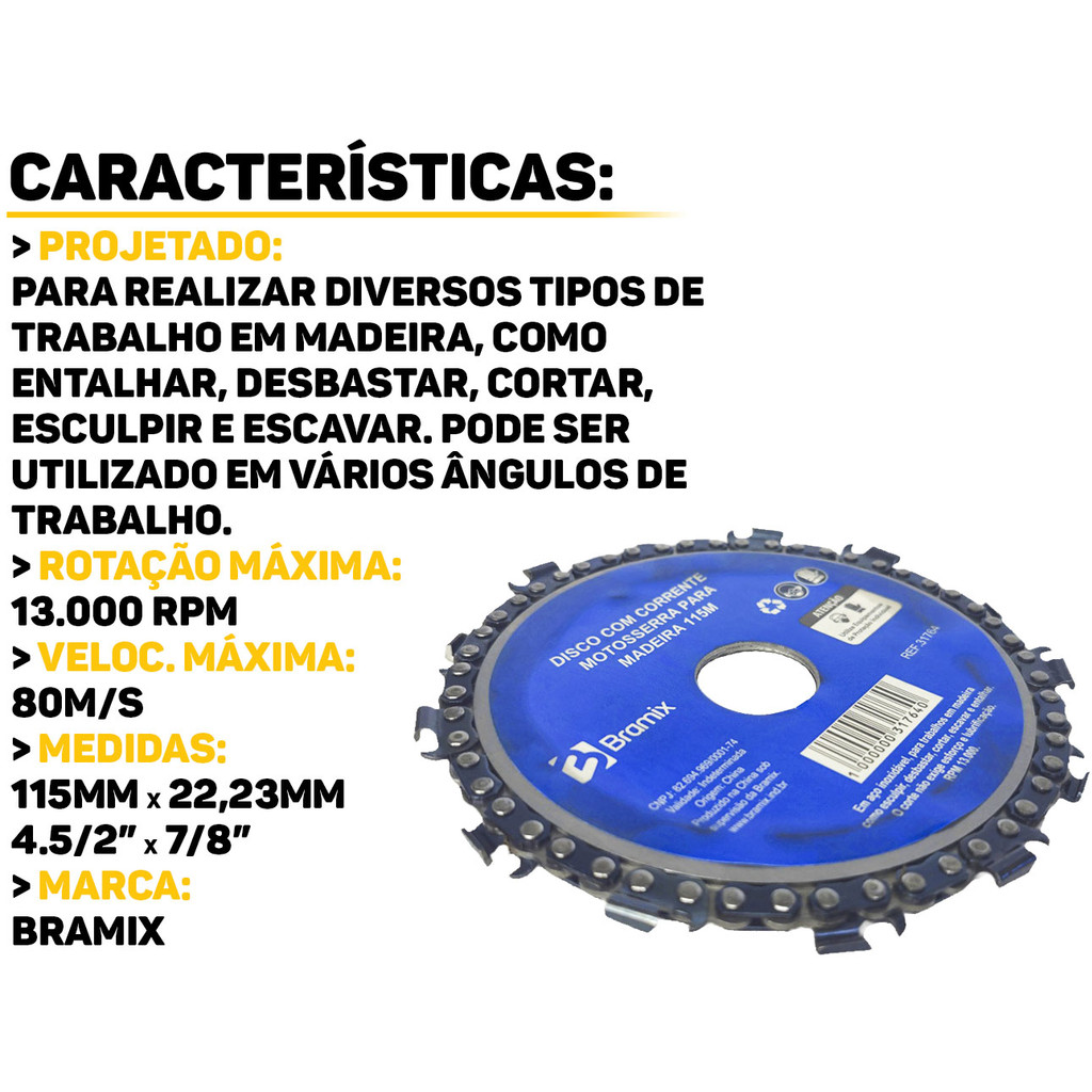 Disco Com Corrente Motosserra Para Madeira 115mm Bramix O Disco Com Corrente Motosserra da Bramix é ideal para profissionais que buscam agilidade e precisão no corte de madeiras. Com sua estrutura robusta e corrente de motosserra ajustada ao disco, permite cortes rápidos e limpos. Características: > Fácil de usar; > Fabricado em aço inoxidável; > O corte não exige esforço e lubrificação; > Ideal para trabalhos em a madeira, como esculpir, desbastar, cortar, escavar e entalhar; > Pode ser utilizado para confecção de caixarias de concreto na construção civil, dobrando a produtividade nos serviços de carpintaria, marcenaria e artesanato. - Marca: Bramix - Garantia: 90 dias contra defeitos de fabricação Vantagens de comprar na Brester: - Produto a pronta entrega. - Produto novo, com garantia de fábrica. - Nota fiscal para Pessoa Física e Pessoa Jurídica.