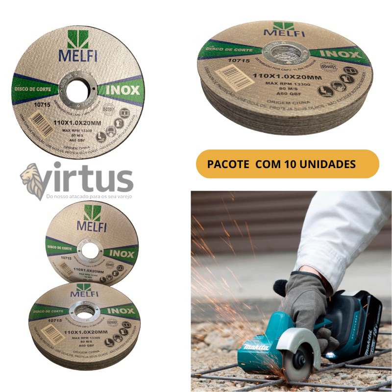 Olá, Bem vindo ao Virtus Atacadista Disco Corte Inox e Ferro Para Lixadeira e Makita 4.1/2 X 1,0 X 20mm 10 PÇS DISCO DE CORTE P/ INOX Dimensão 110,0 x 1,0 x 20,0mm (USO EM MAKITA E LIXADEIRA PEQUENA) Disco produzido em óxido de alumínio. Corpo reforçado com 2 malhas de fibra de vidro. Anel interno de aço carbono. Aplicações: Utilizado juntamente com serras mármores nos trabalhos de corte em inoxidáveis. Proporciona um excelente rendimento nas operações de corte, devido a sua espessura mais fina que os discos de corte normais. ORIENTAÇÕES GERAIS Sempre utilize óculos e luvas de segurança, protetor auricular, máscara de proteção contra poeira e vestimentas adequadas. Sempre manuseie e armazene os discos com cuidado. Sempre desconectar a maquina da energia elétrica para instalação ou remoção do disco Antes da utilização, faça uma avaliação visual certificando-se para que não haja danos ou trincas nos discos. Certifique-se que a velocidade do equipamento não exceda a velocidade máxima marcada nos discos. Utilize flanges de tamanho igual e modelo apropriado para cada tipo de disco. Utilizar sempre um ângulo de trabalho de 90º, para os discos de corte Sempre utilize o protetor de segurança do equipamento. Sempre que utilizar discos novos, antes da operação trabalhe com a máxima rotação, sem carga, por um minuto em área protegida. Tal procedimento tem o objetivo de verificar a integridade dos discos. Utilize apoio para os braços, se necessário. O ambiente de trabalho deve ser ventilado para evitar doenças respiratórias. Não utilize discos que foram expostos a umidade e temperatura demasiada. Não utilize discos que sofreram quedas ou que apresentem danos. No momento da montagem, não force os discos contra o equipamento ou altere o tamanho do furo central. Não aperte as flanges excessivamente. Não exceda a velocidade máxima marcada nos discos. Não fique diretamente em frente aos discos durante a operação. Não utilize os discos para outros fins a não ser para os que foram projetados. Não utilize discos de corte para desbastar peças. Não trabalhe com discos abrasivos sem equipamentos de proteção. Armazenar sempre em local limpo e seco. Ainda com dúvidas ? nós chame no chat, responderemos o mais rápido possível. Agradecemos a sua preferência!