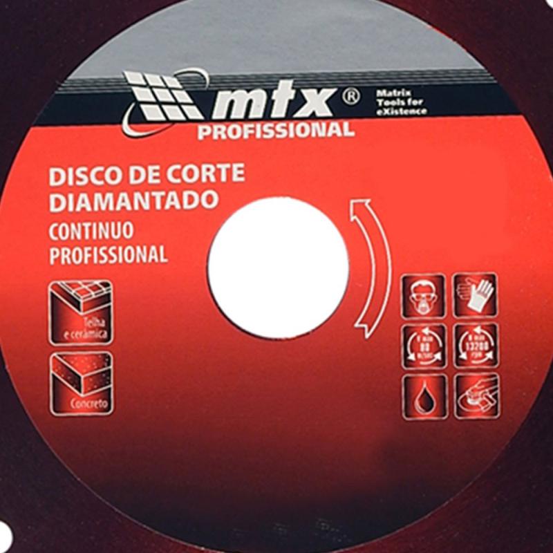 Disco de Corte Diamantado 9 POL 230 x 25,4 MM Corte Molhado Contínuo 731929 MTXOs discos são projetados para cortar mármore e granito.A camada de corte contínuo do disco garante bordas suaves sem lascas ou rachaduras.Projetado para corte úmido de ladrilhos cerâmicos, pedra natural e alvenaria.DADOS TÉCNICOS:Largura do Corte: 6mmEspessura: 1,4mmDiâmetro: 230mmFuro: 25,4mmCódigo de Fábrica: 731929Marca: MTXGarantia: 3 meses* Imagens meramente ilustrativas.